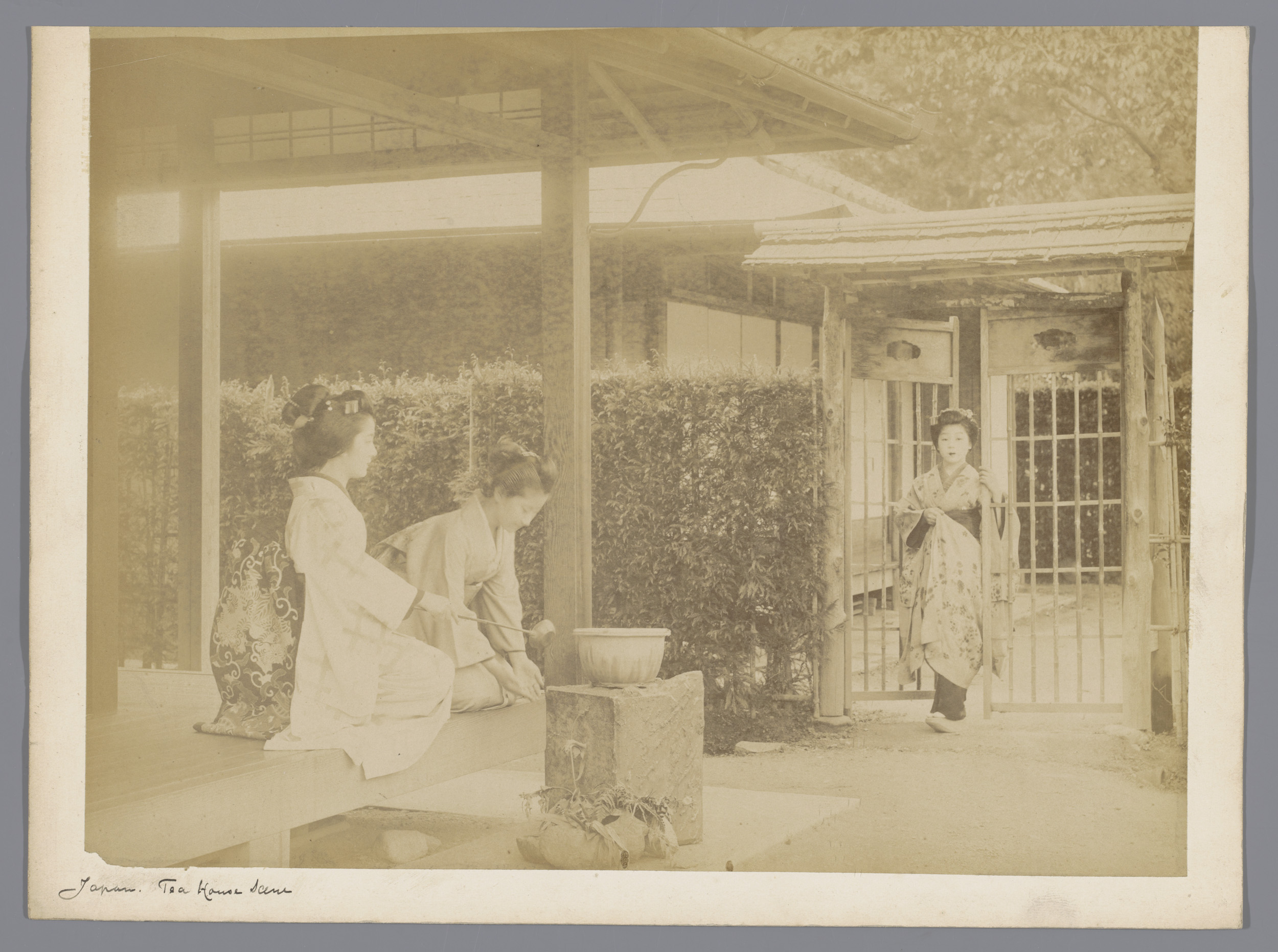 Drie onbekende Japanse meisjes bij een Japans theehuis