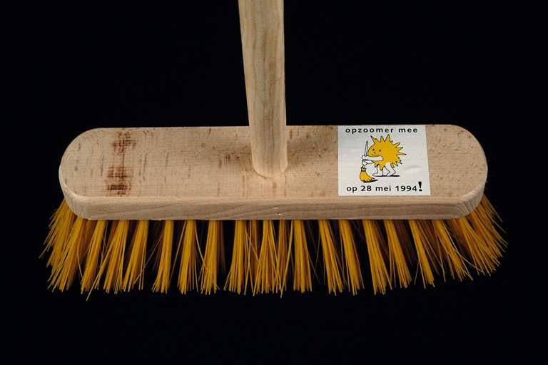 Bezem met op sticker: "opzoomer mee op 28 mei 1994!"