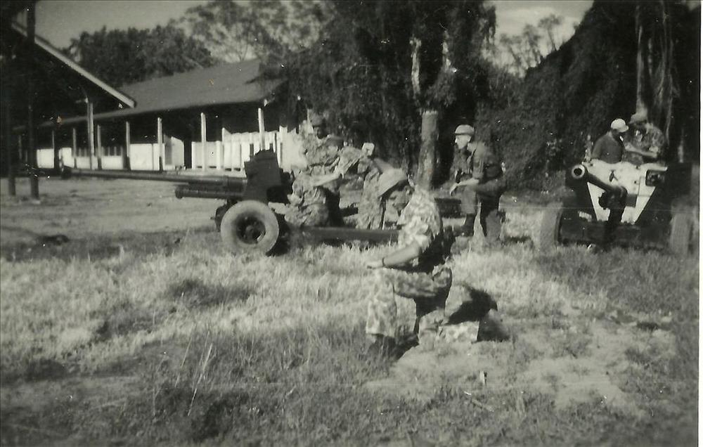 Indië na WO 2, Sumatra; militair, geschut, gebouw, boom