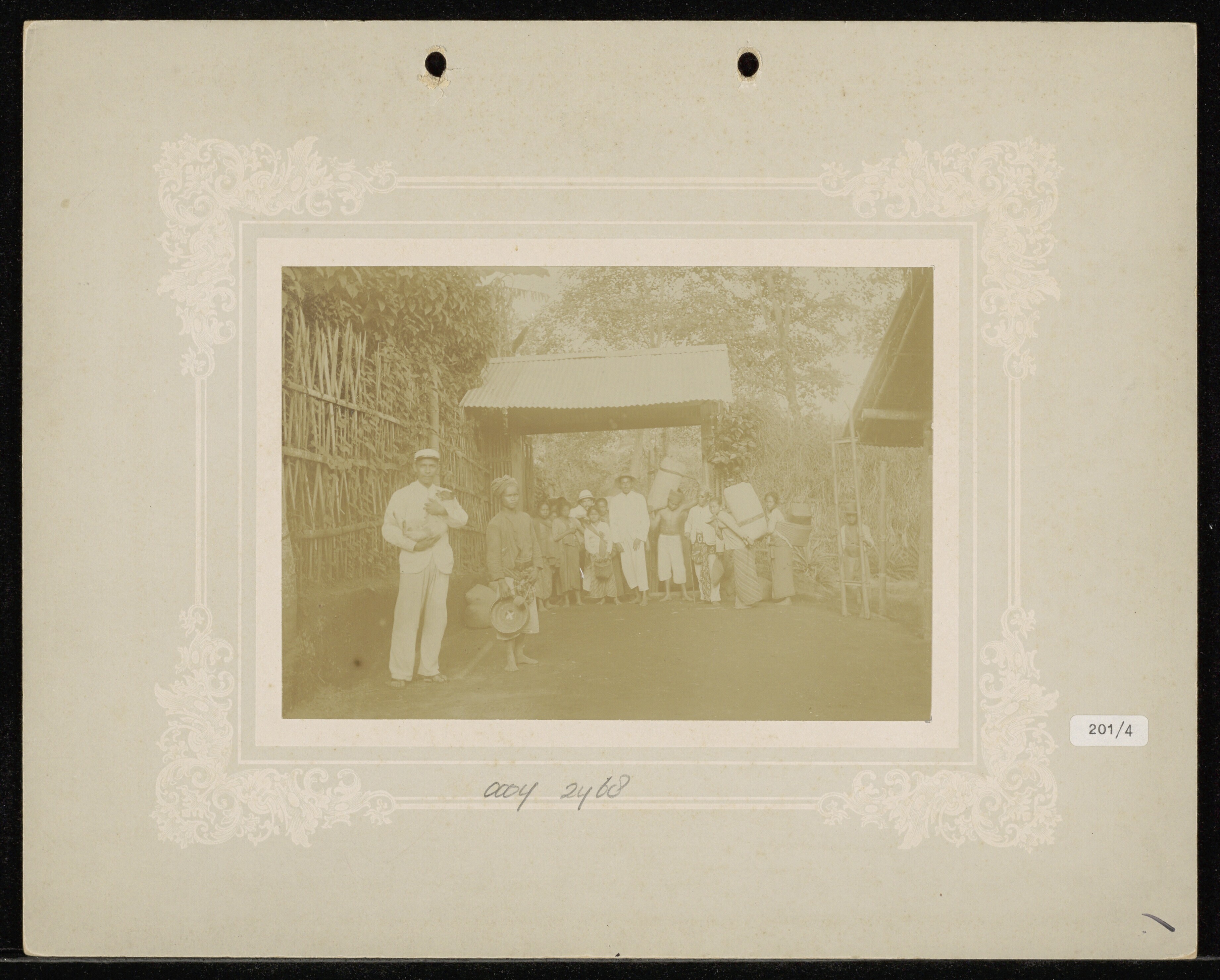 Ingang van een dessa met Javaanse (?) mannen en bote...
