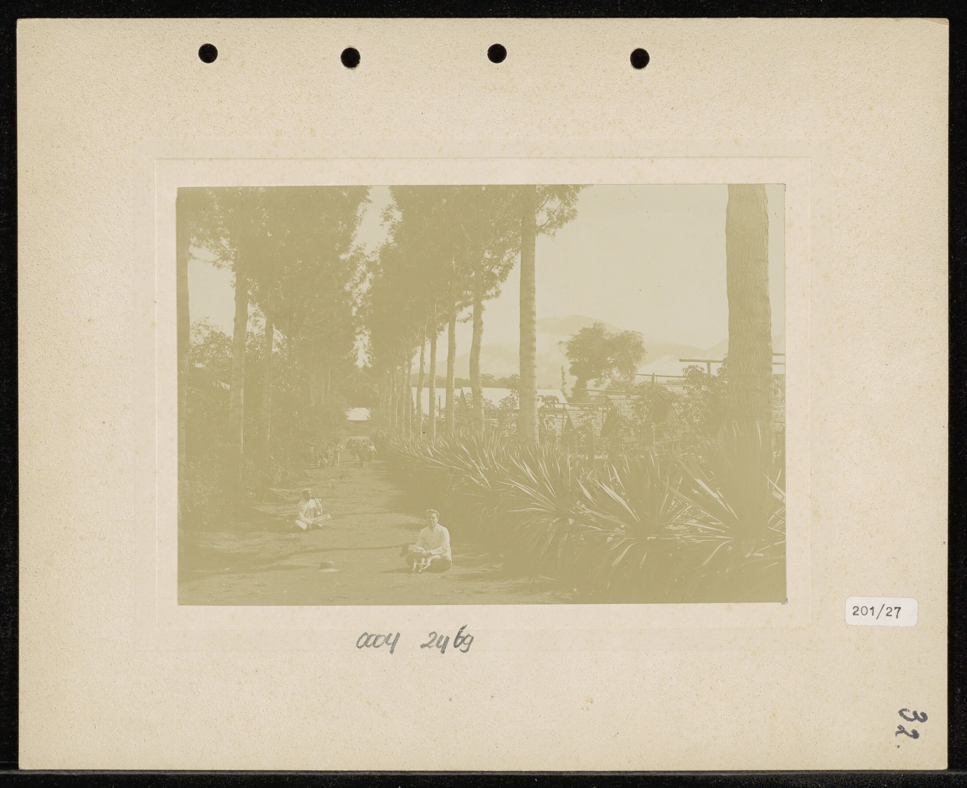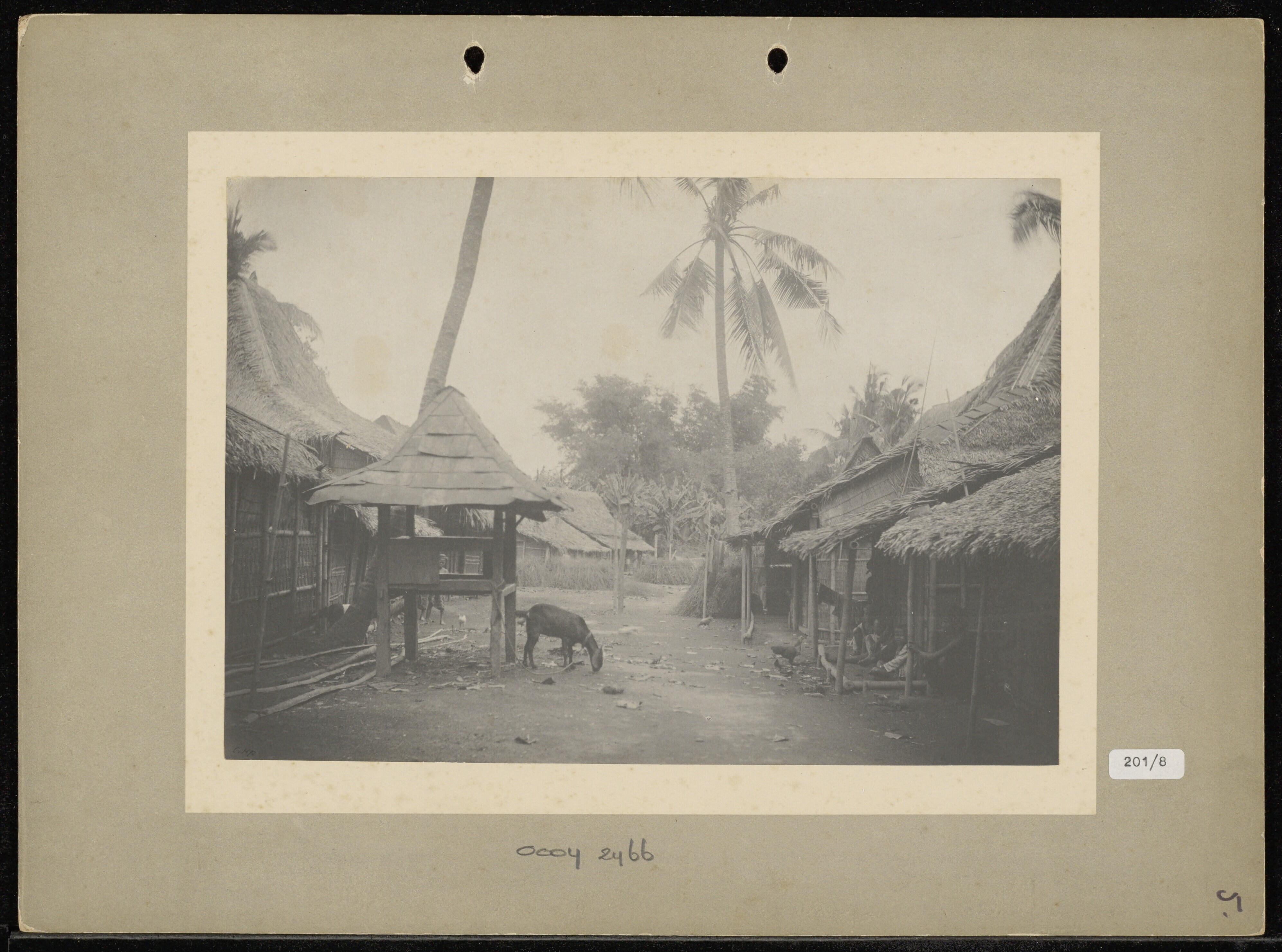 Ingang van een dessa met Javaanse (?) mannen en bote...