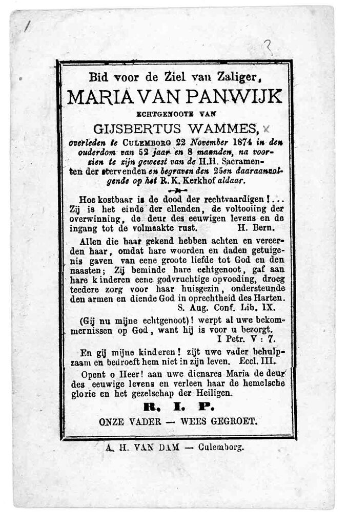 bidprent voor Maria van Panwijk. Geboren 1822. Overl...