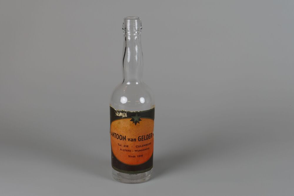 fles van kleurloos glas met etiket, geassocieerd met...