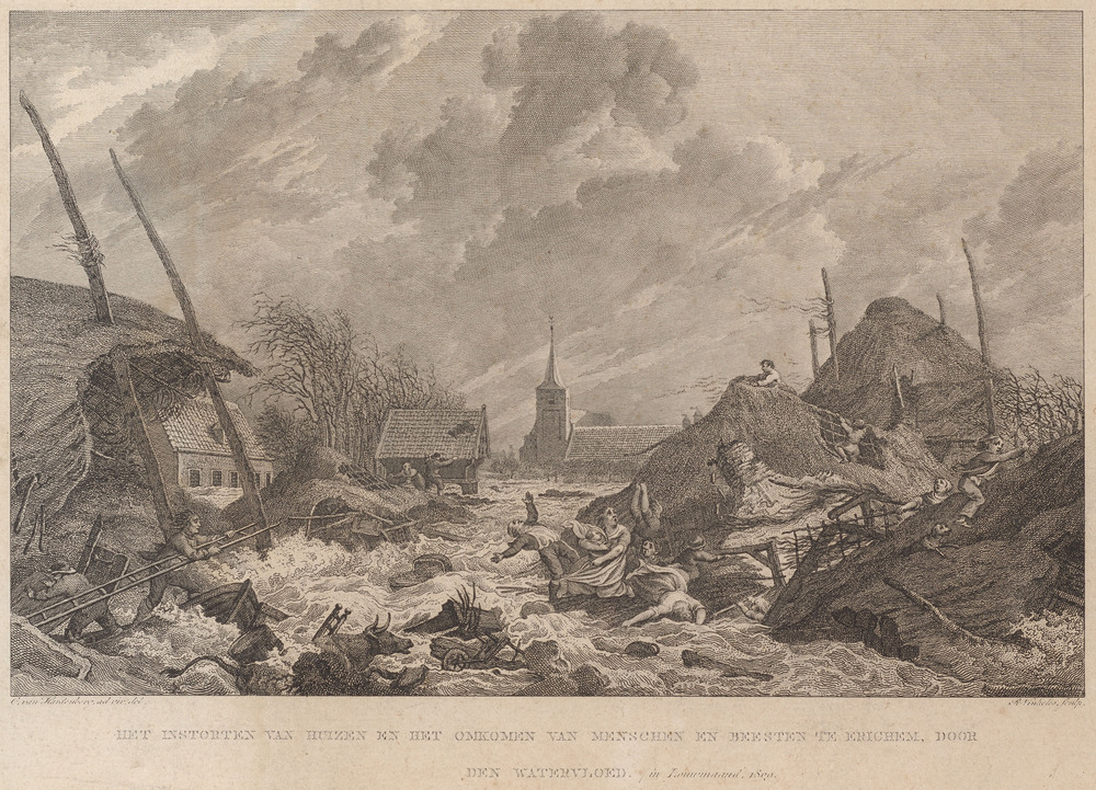 Gravure met afbeelding van de watervloed te Erichem ...