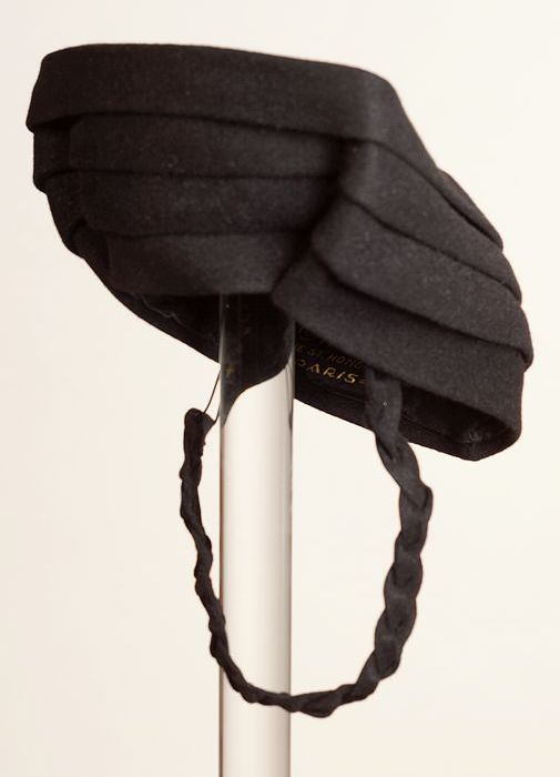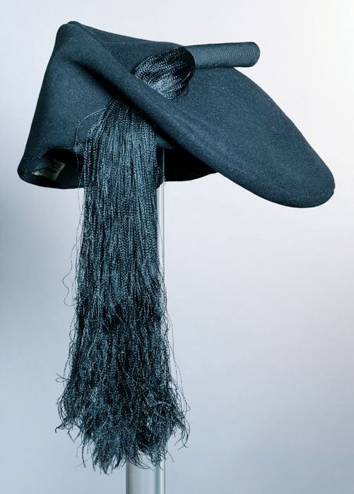 Zwart vilten dameshoed in vorm van pet met lange afh...