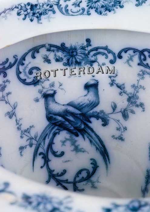 Witte toiletpot met blauwe vogels en bloemdecoratie ...