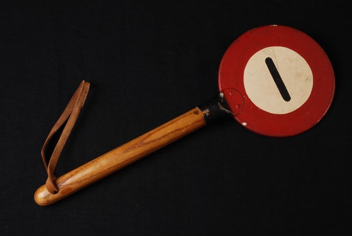 Rond signaalbordje in rood, wit en zwart op een hand...