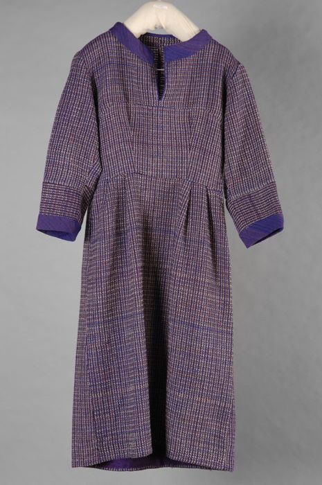 Donkerblauw tweedelig mantelpak, jas en klokkende rok