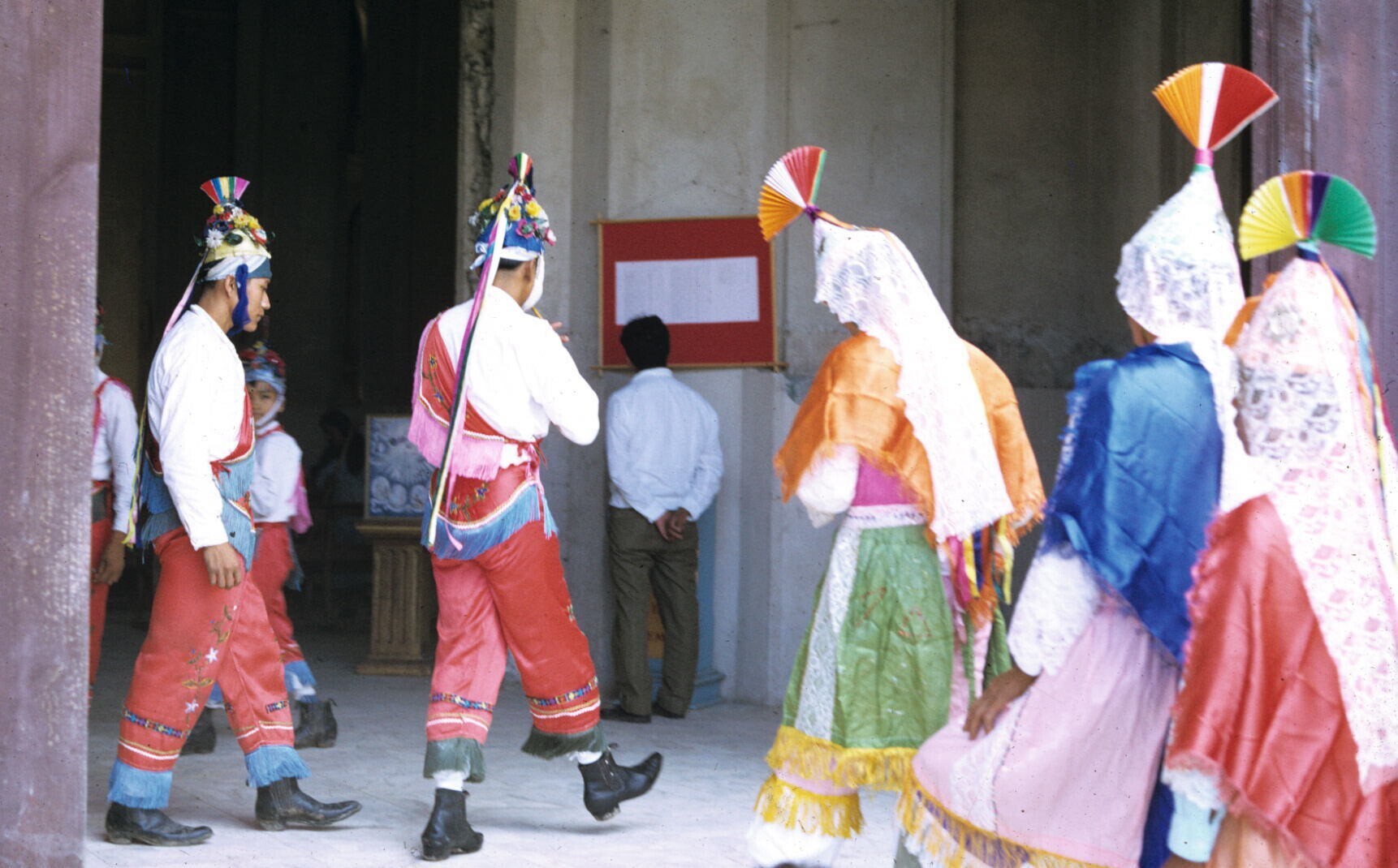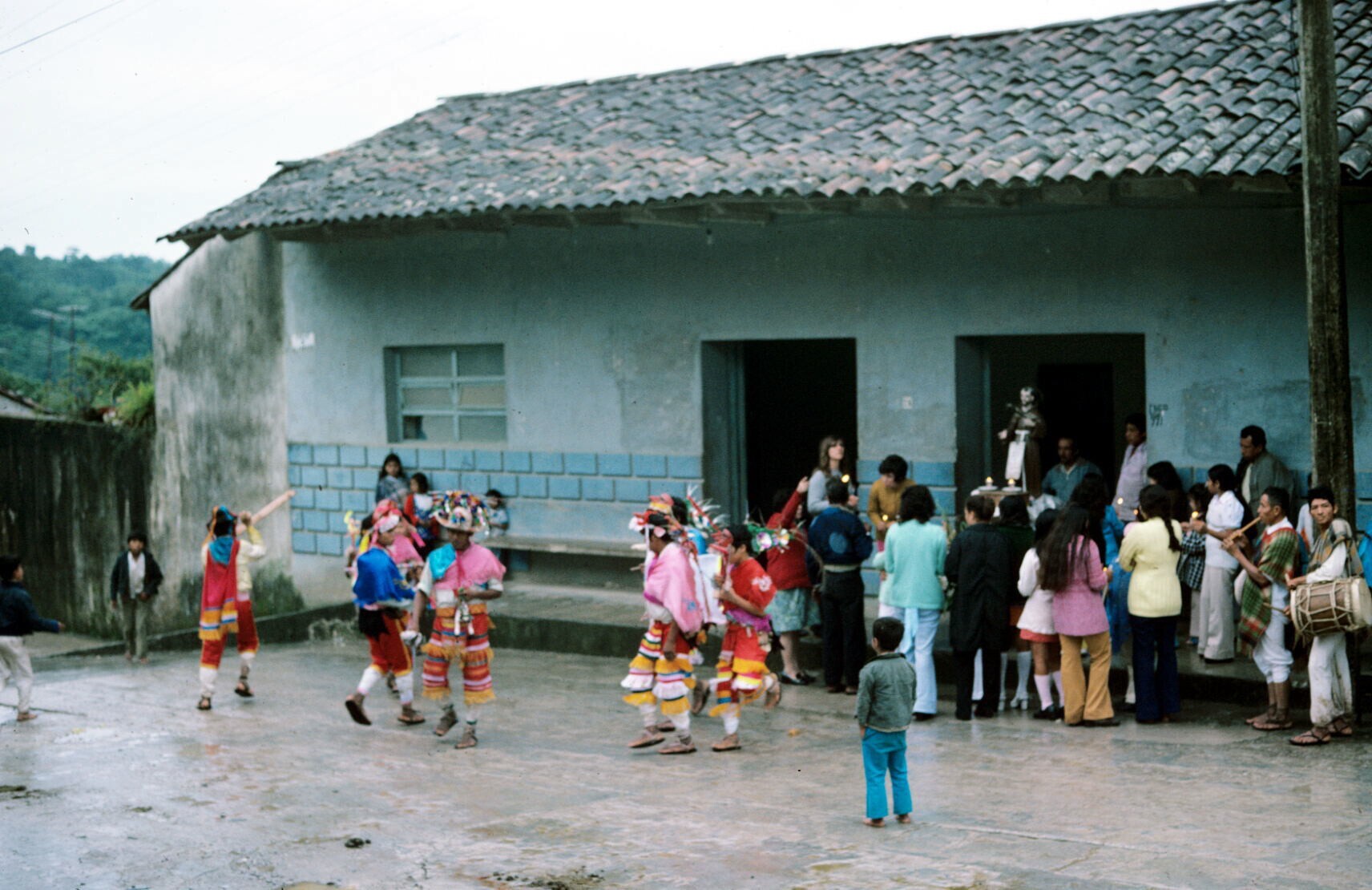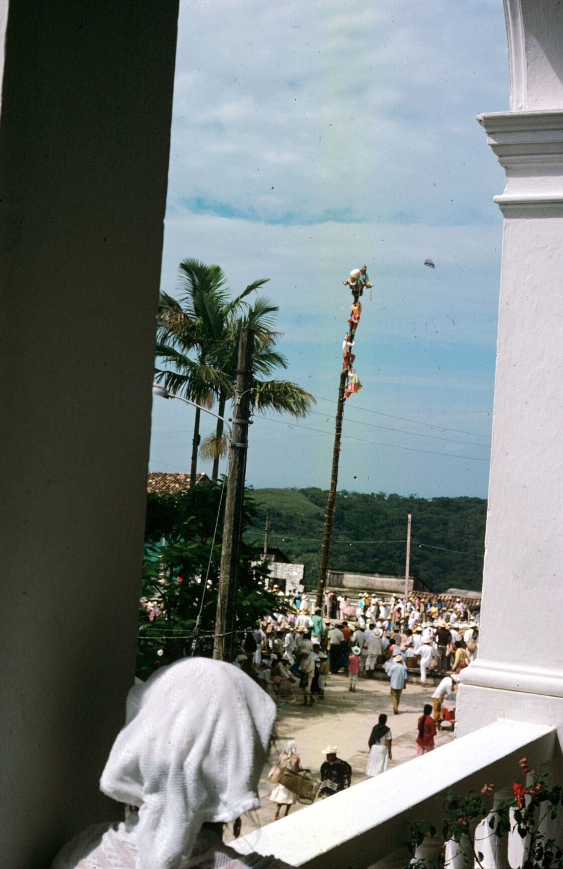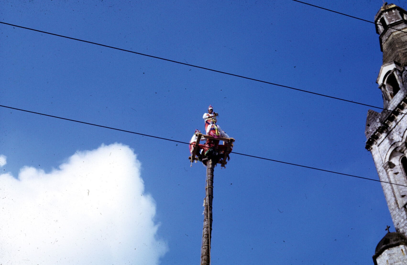 de voladores bovenin 'palo volador', met muzikant de...