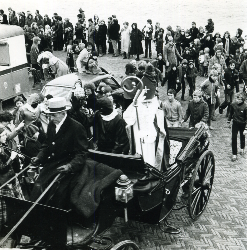 Zwart-wit foto van de intocht van Sint Nicolaas in T...