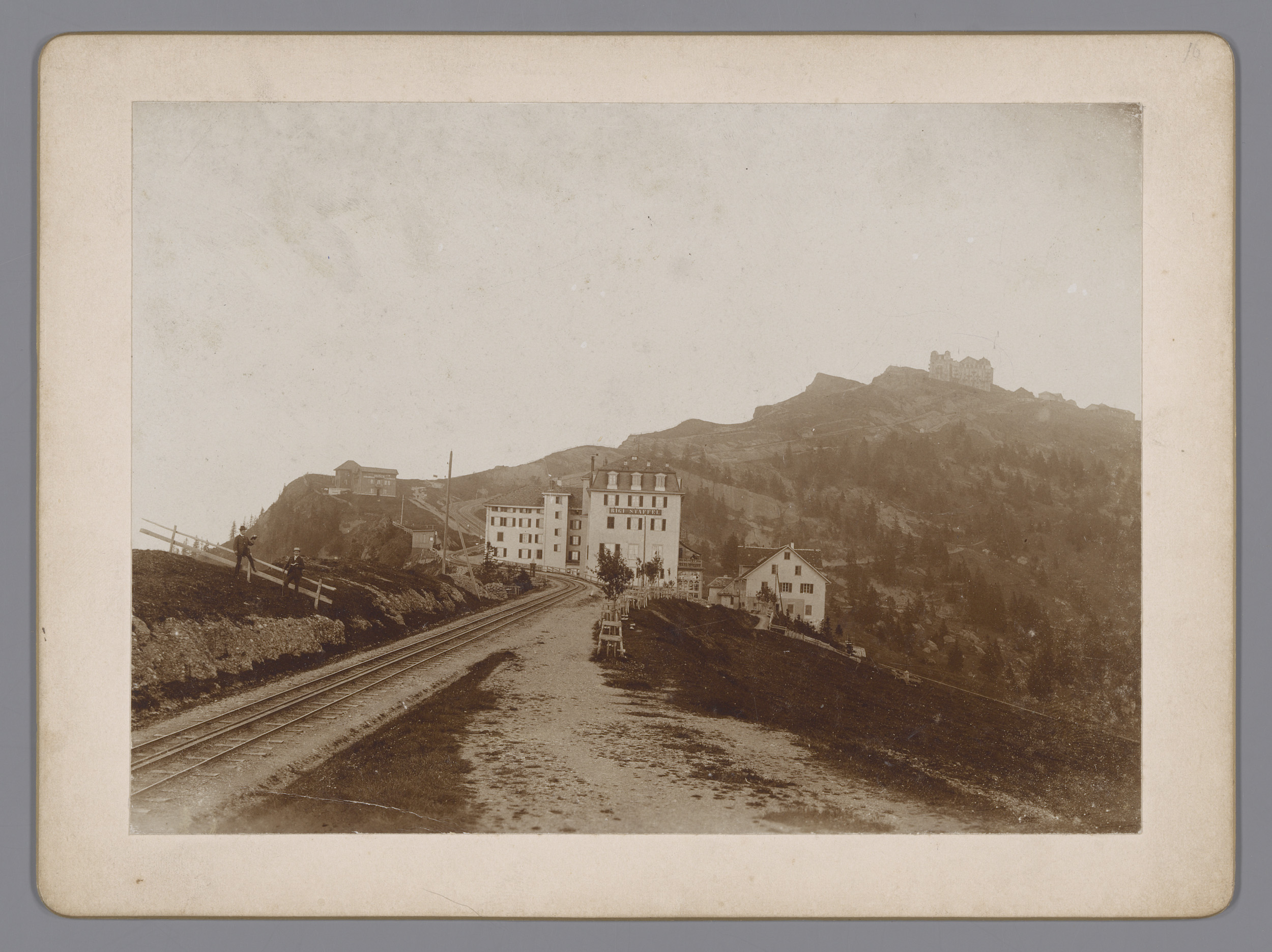 Gezicht op een spoorlijn en hotel in Rigi Staffel