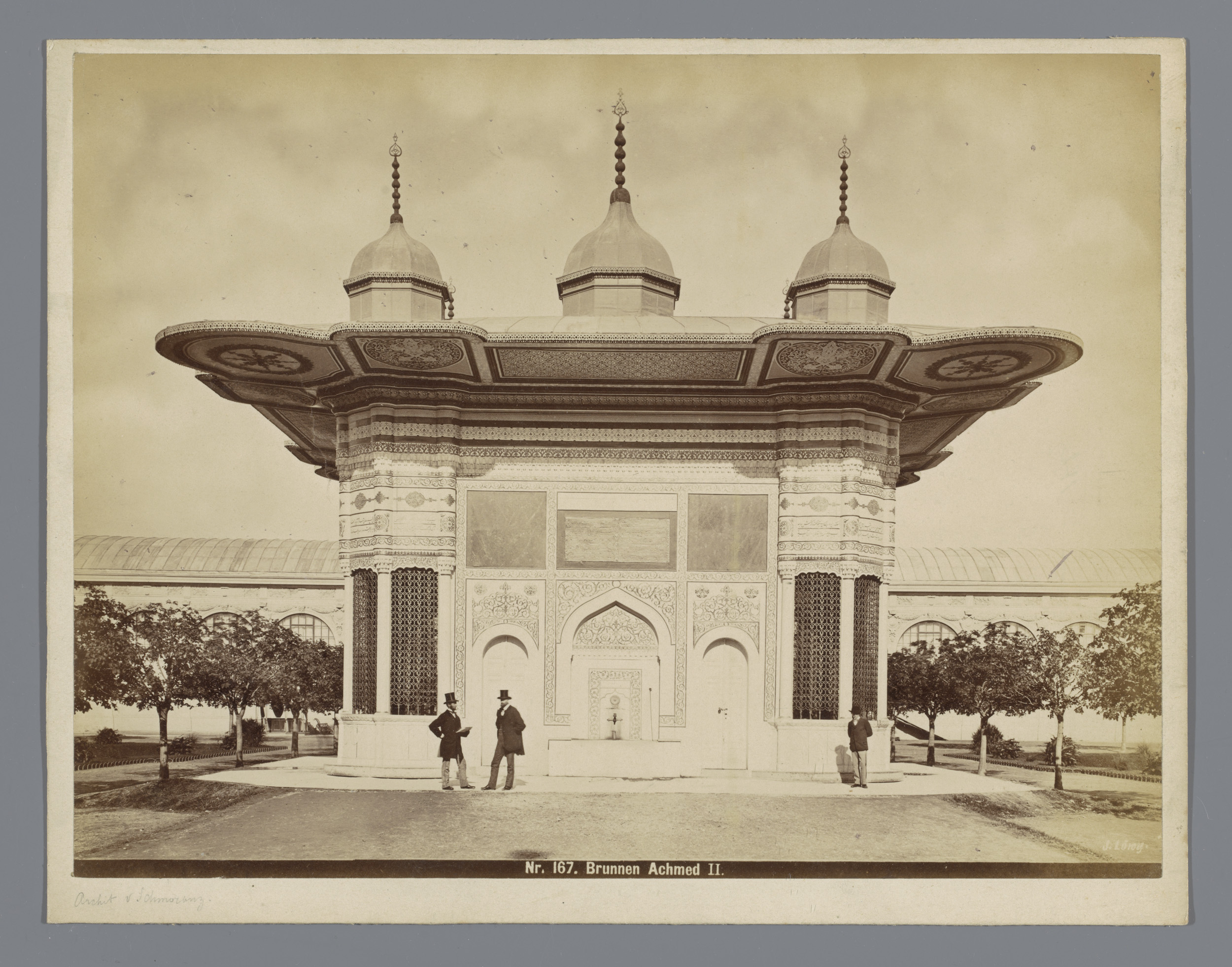Drie mannen voor de fontein van Ahmet III in Istanbo...