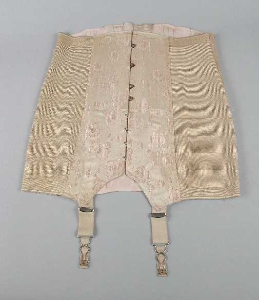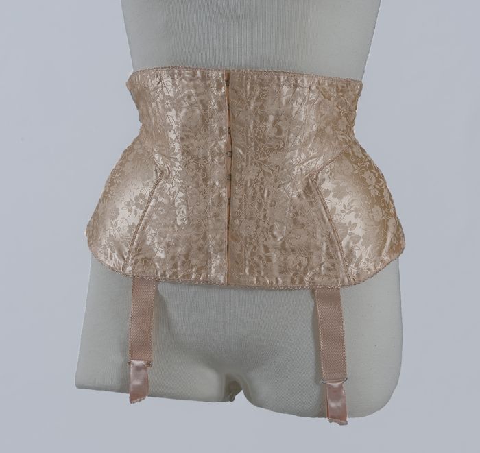 Beige heupkorset met ingeweven roze bloemmotief, zij...