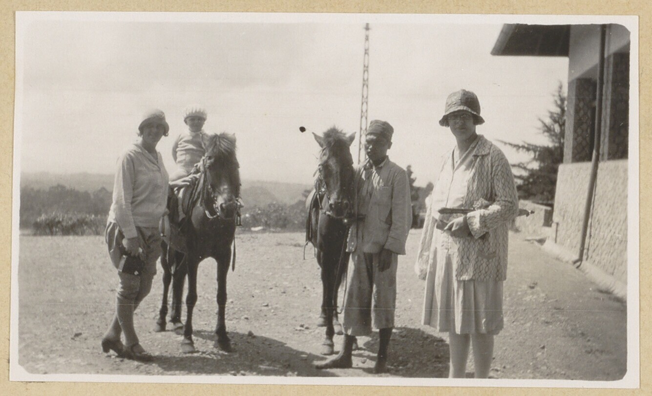 Portret van twee Europese vrouwen met kind te paard ...