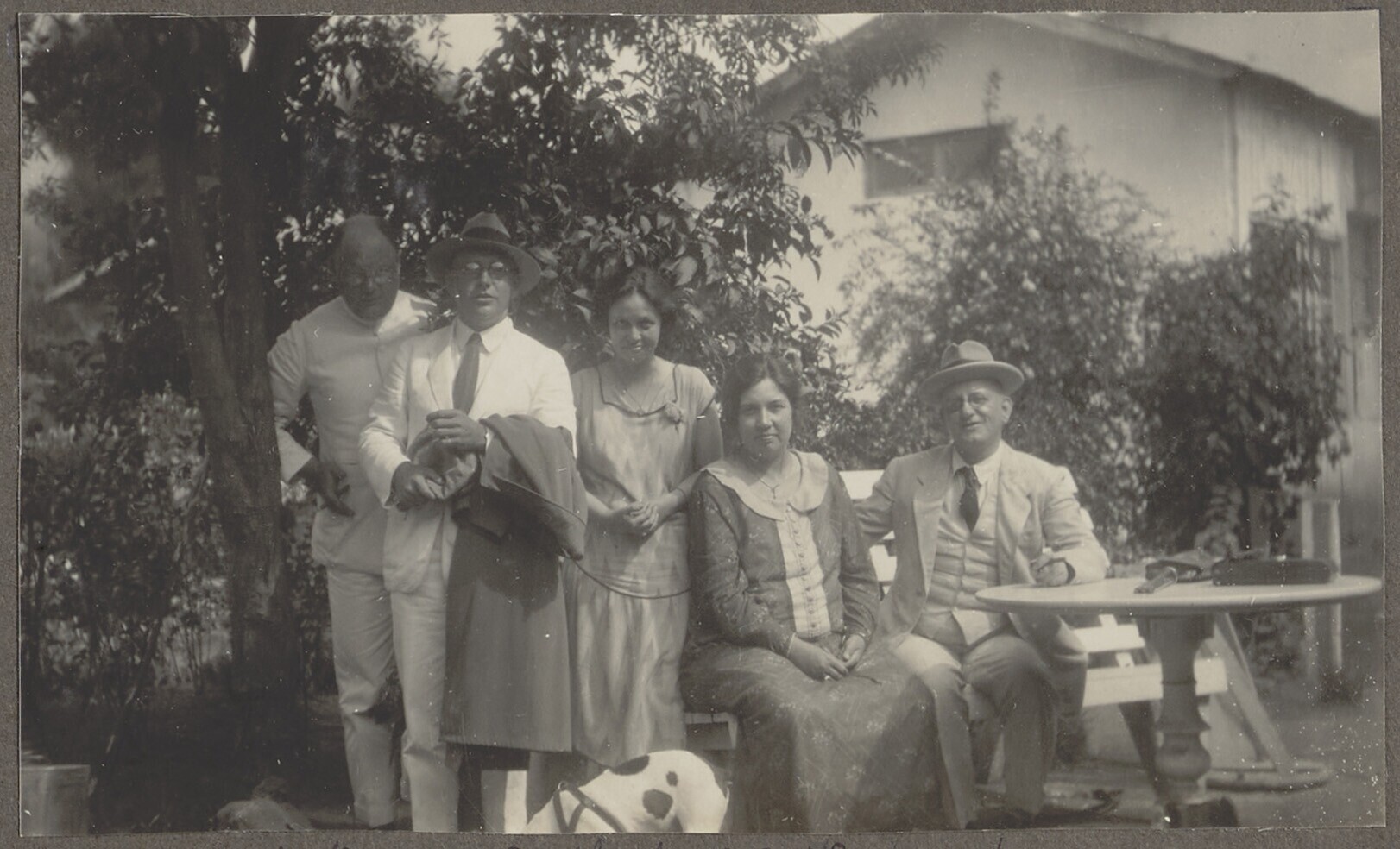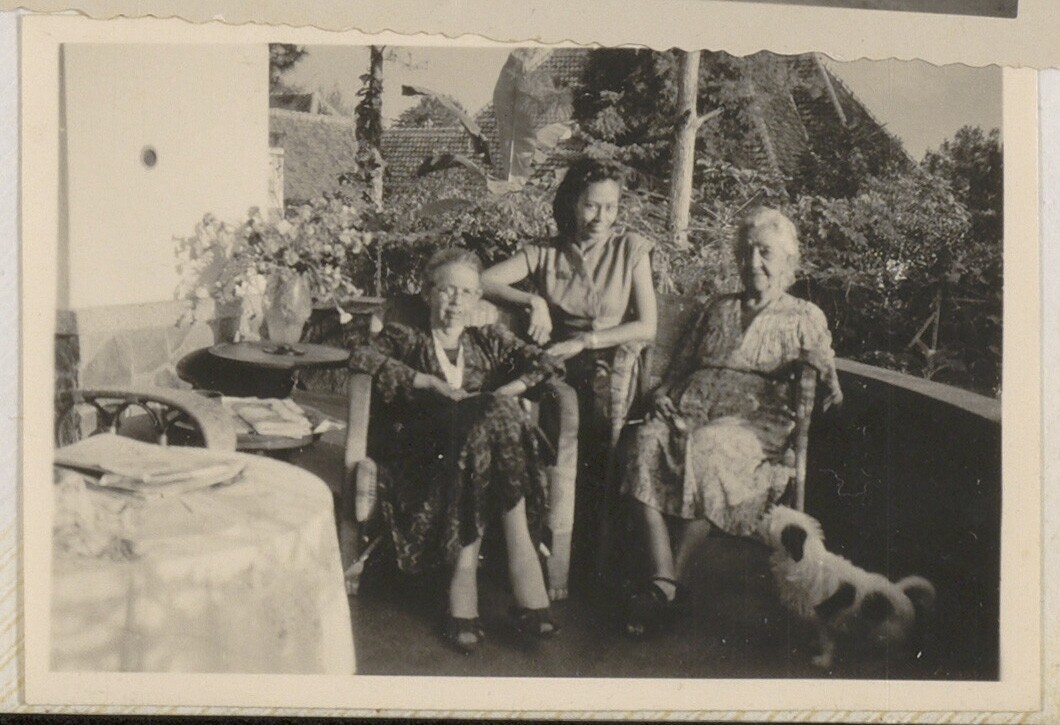 Portret van vrouwen en hond op het terras van een wo...