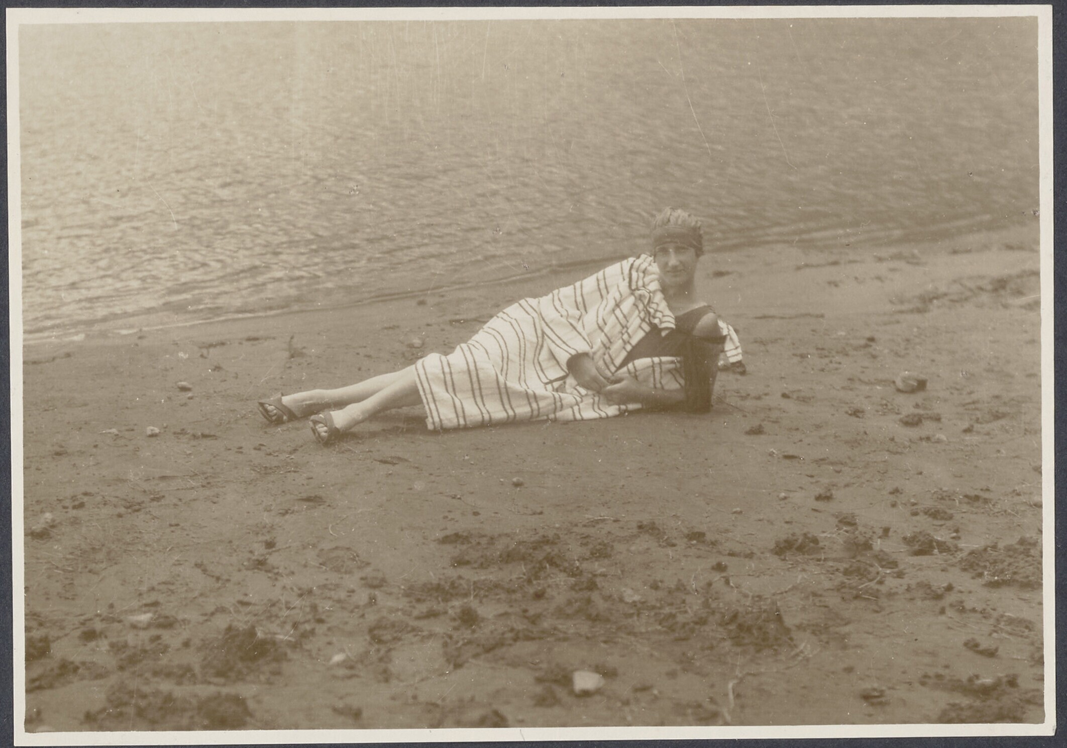Portret van een vrouw liggend op de oever van het me...