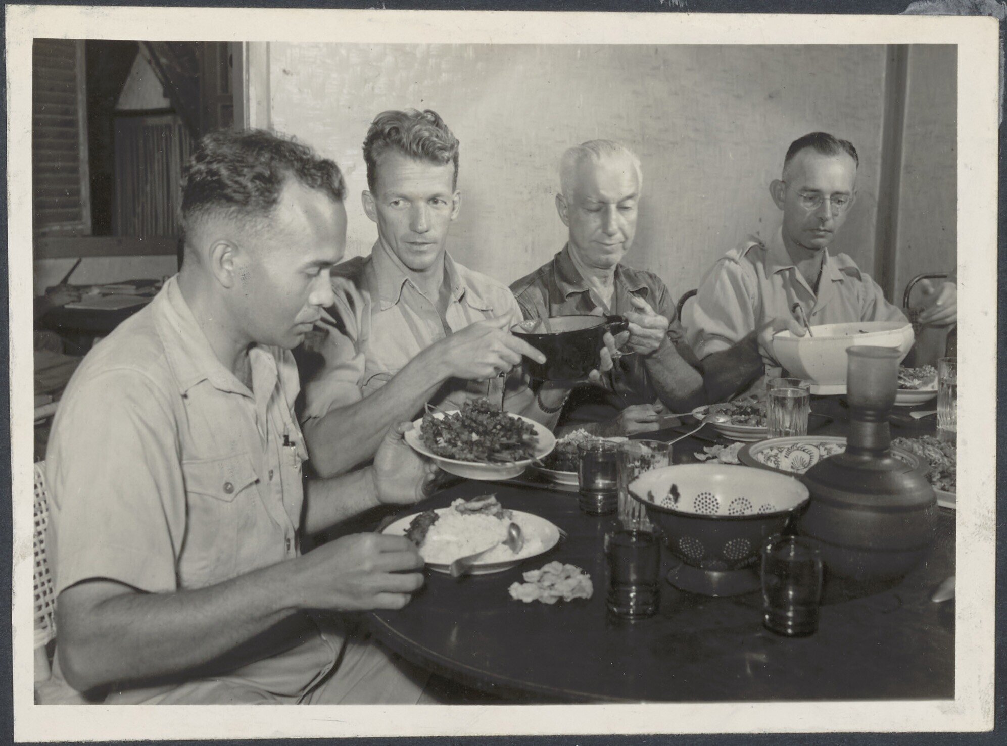 Portret van vier mannen tijdens het nuttigen van een...