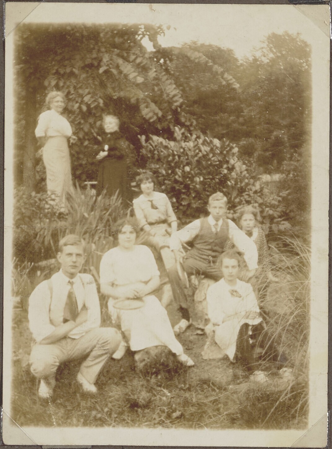 Portret van mannen en vrouwen in de tuin van het zie...