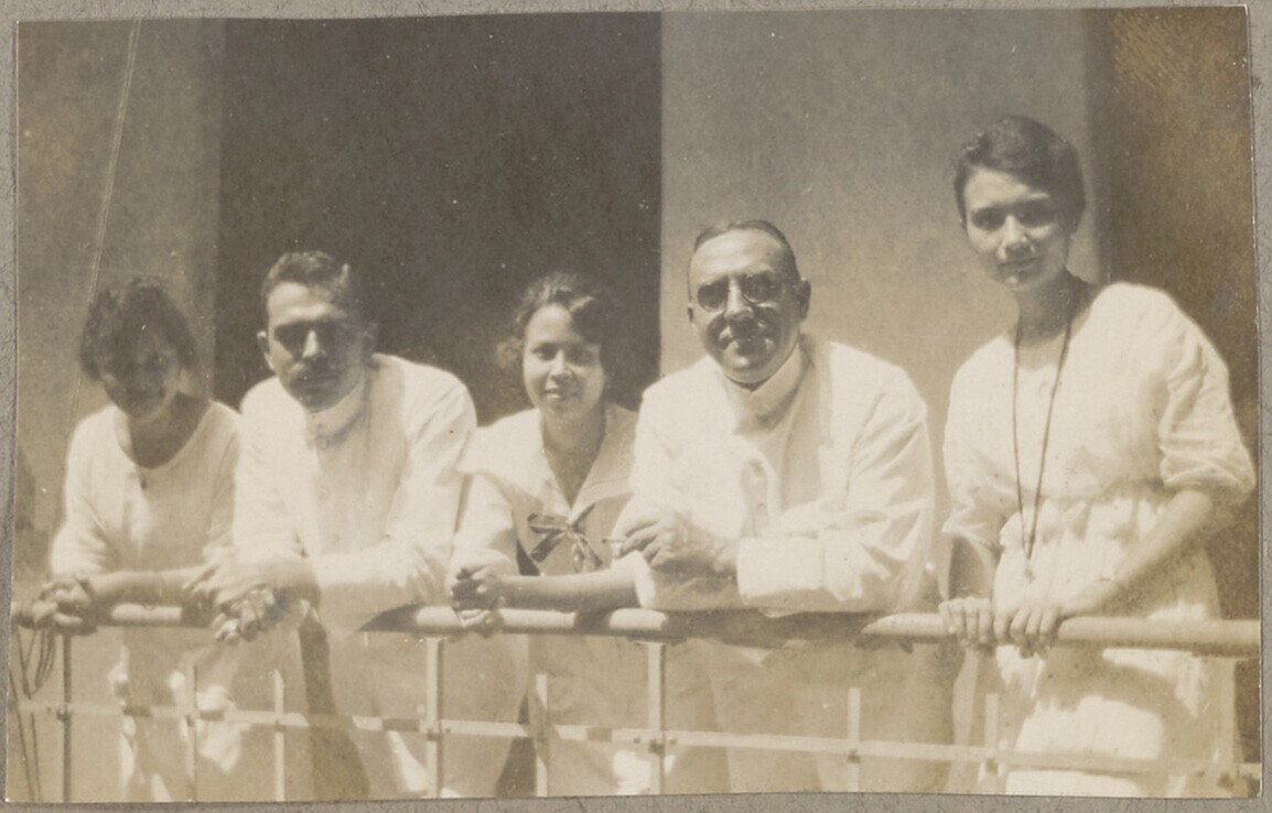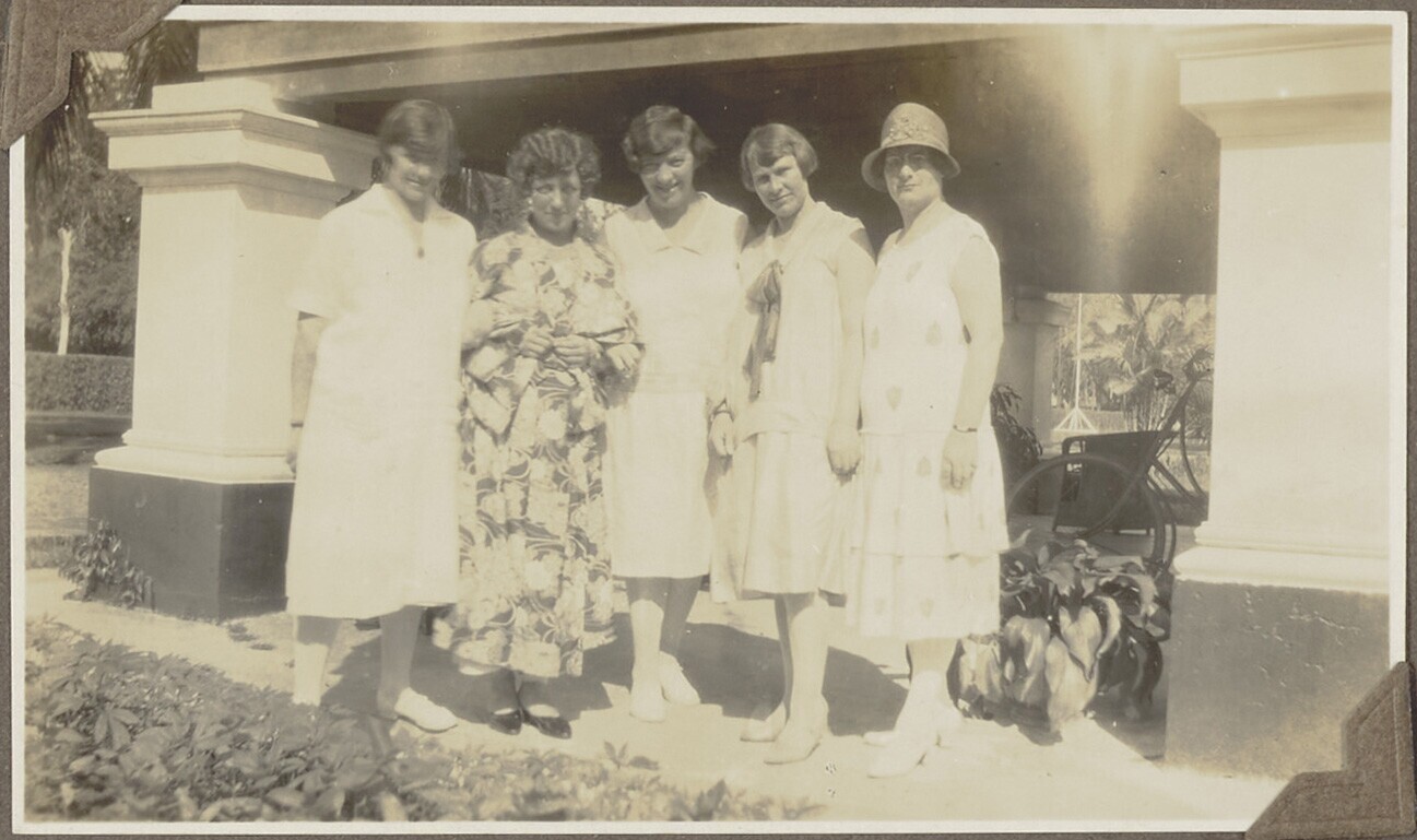 Portret van vijf vrouwen op het terras van de woning