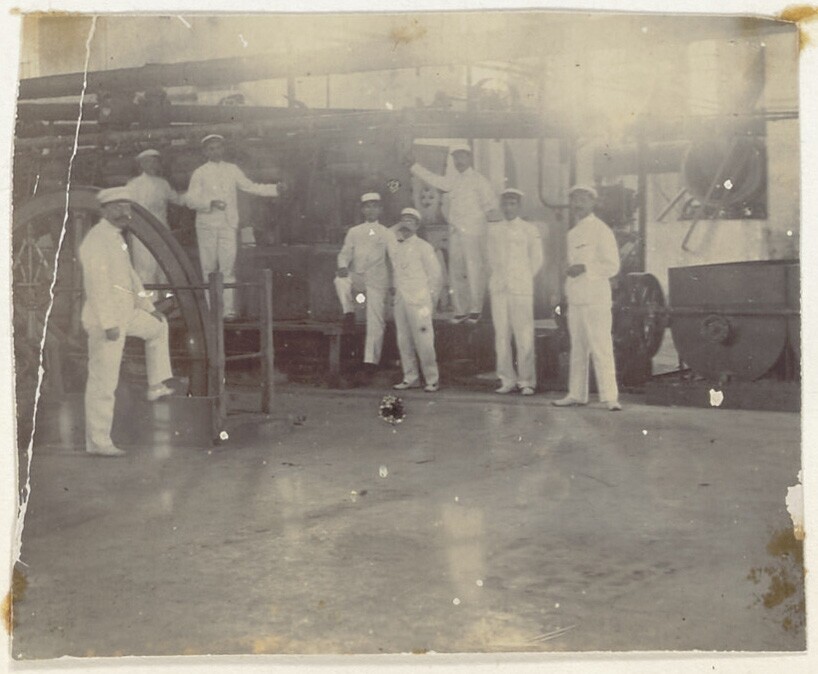 Portret van een groep mannen in machinekamer van sui...