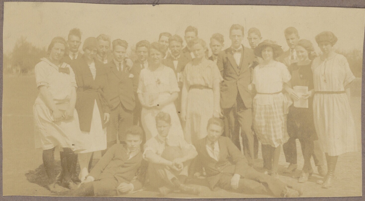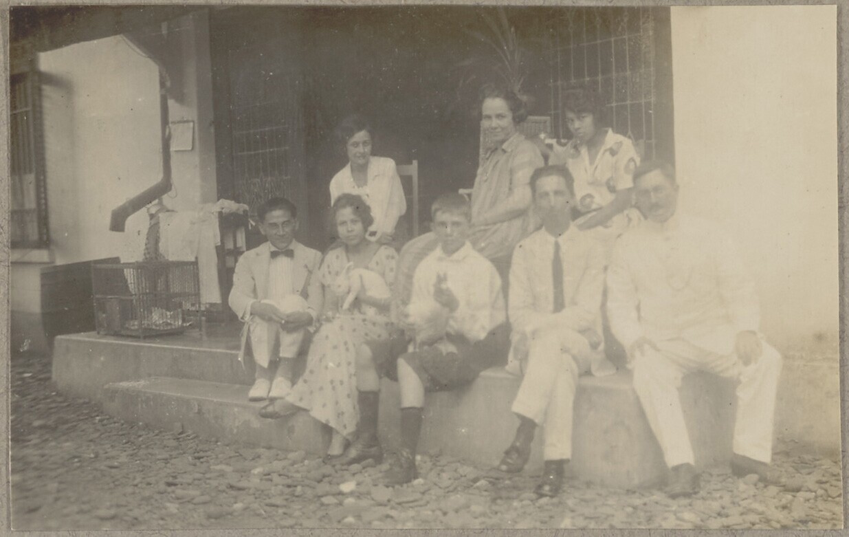 Groepsportret van gezelschap op de trap van een huis...