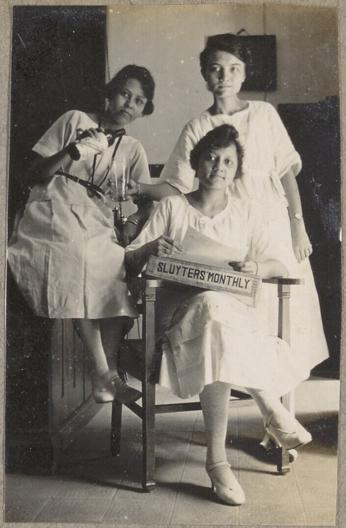 Portret van drie vrouwen op kantoor van uitgeverij S...