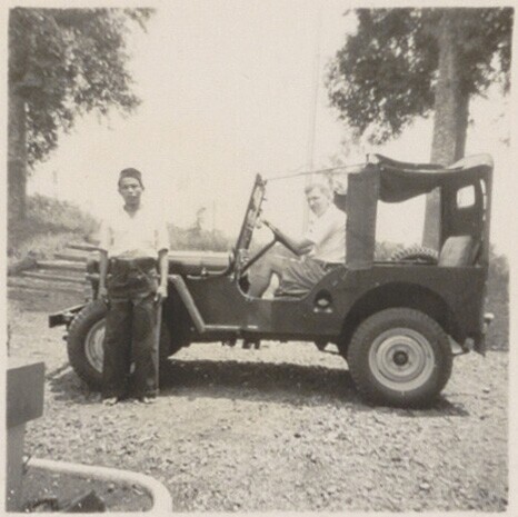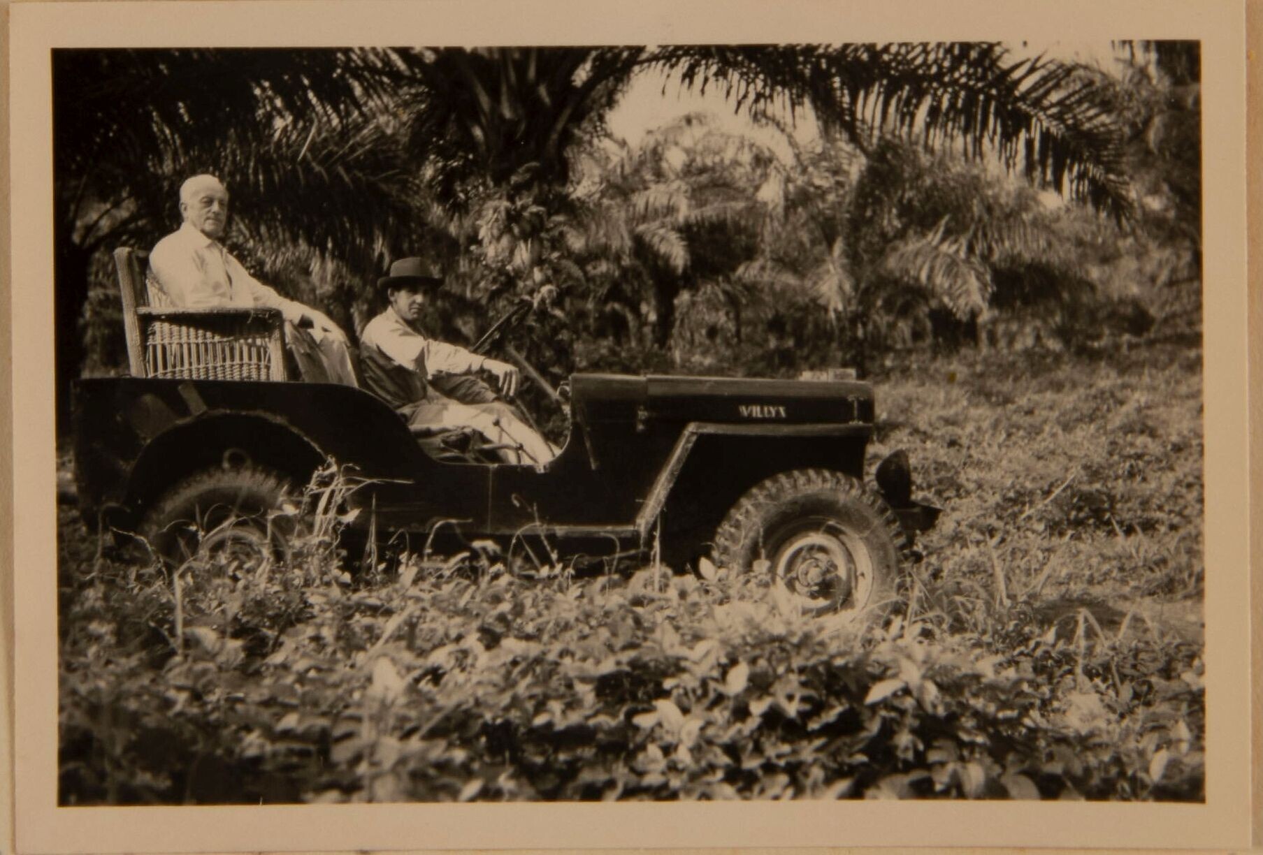 Portret van mannen bij een jeep van het Rode Kruis
