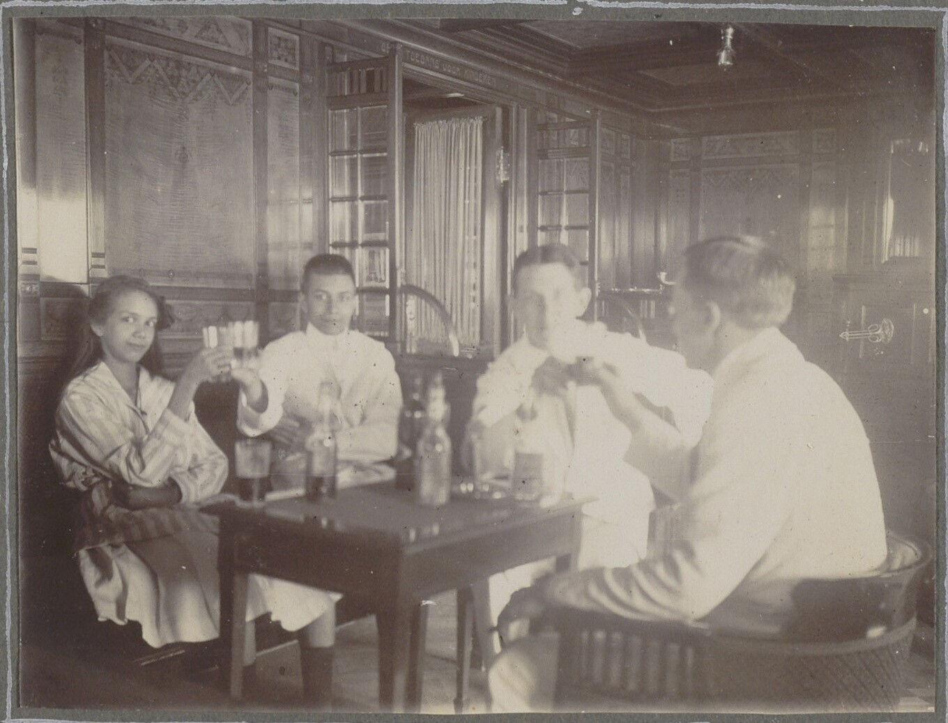 Portret van jonge dames en een jongen op een bank op...