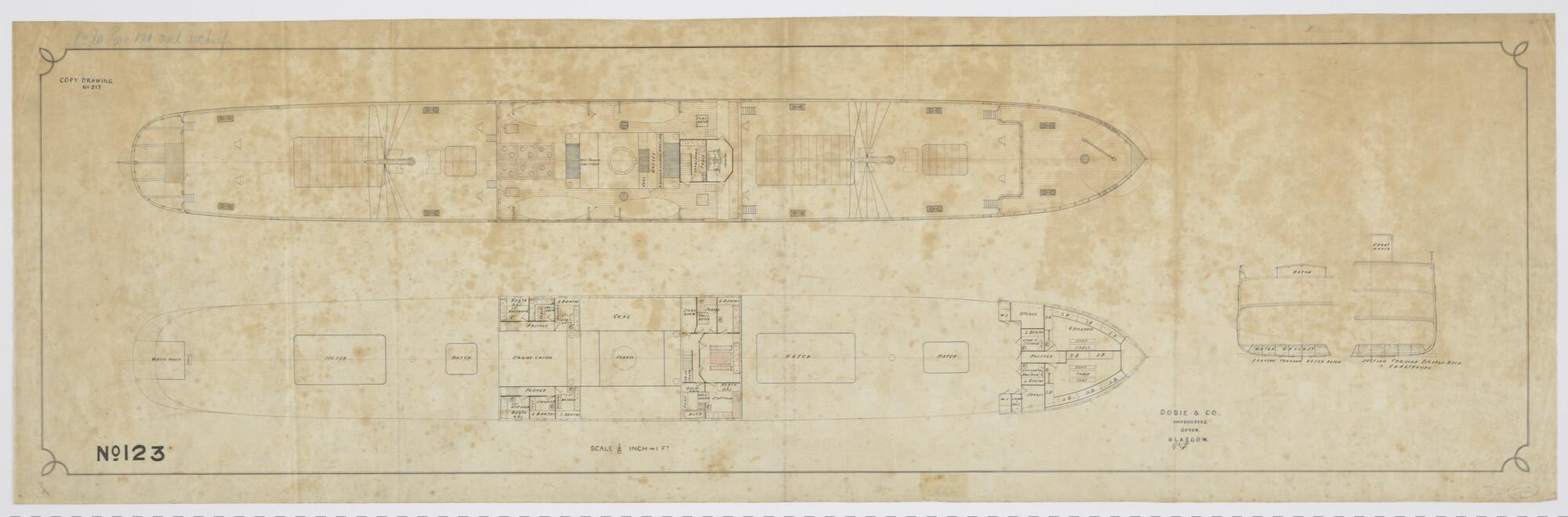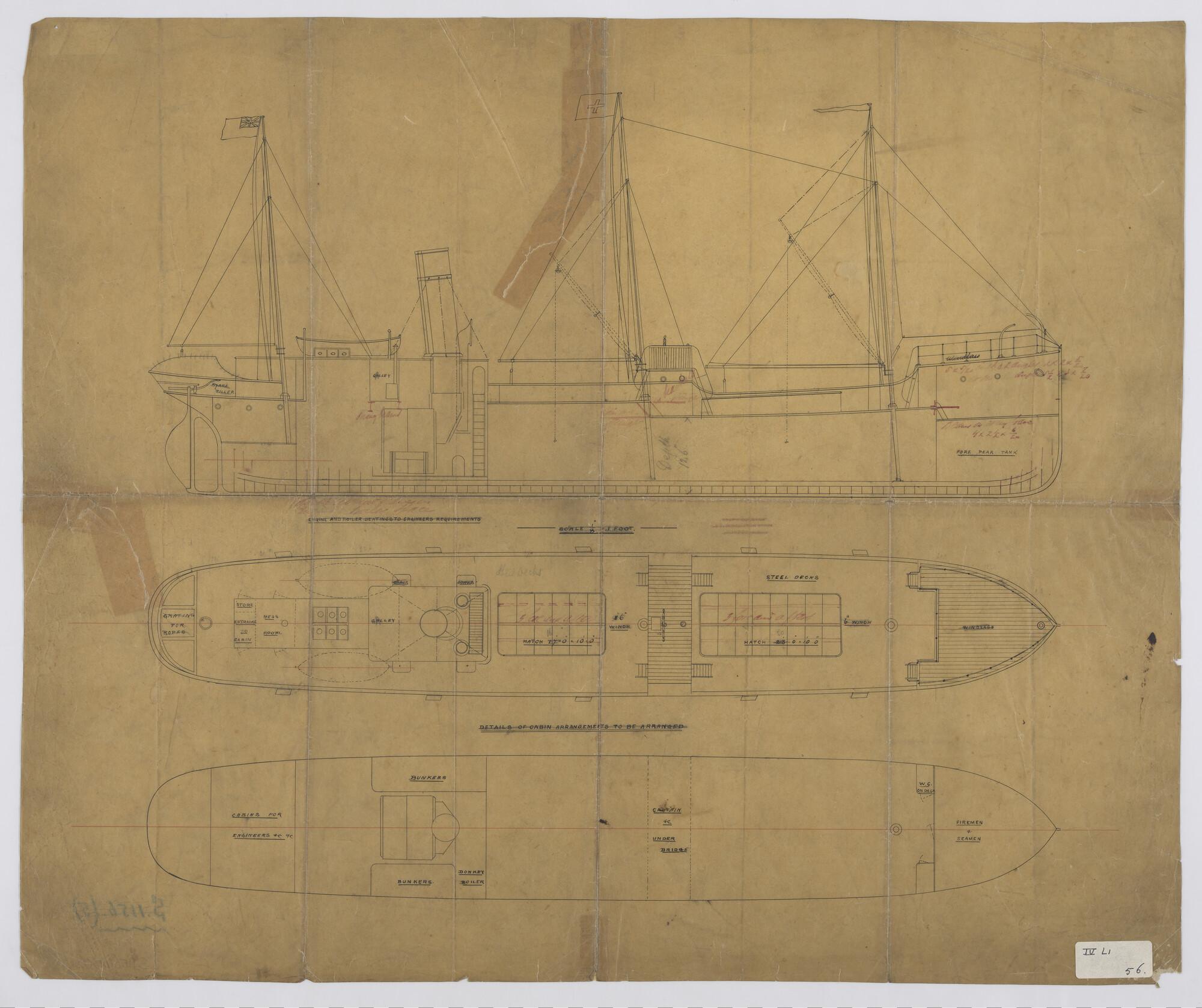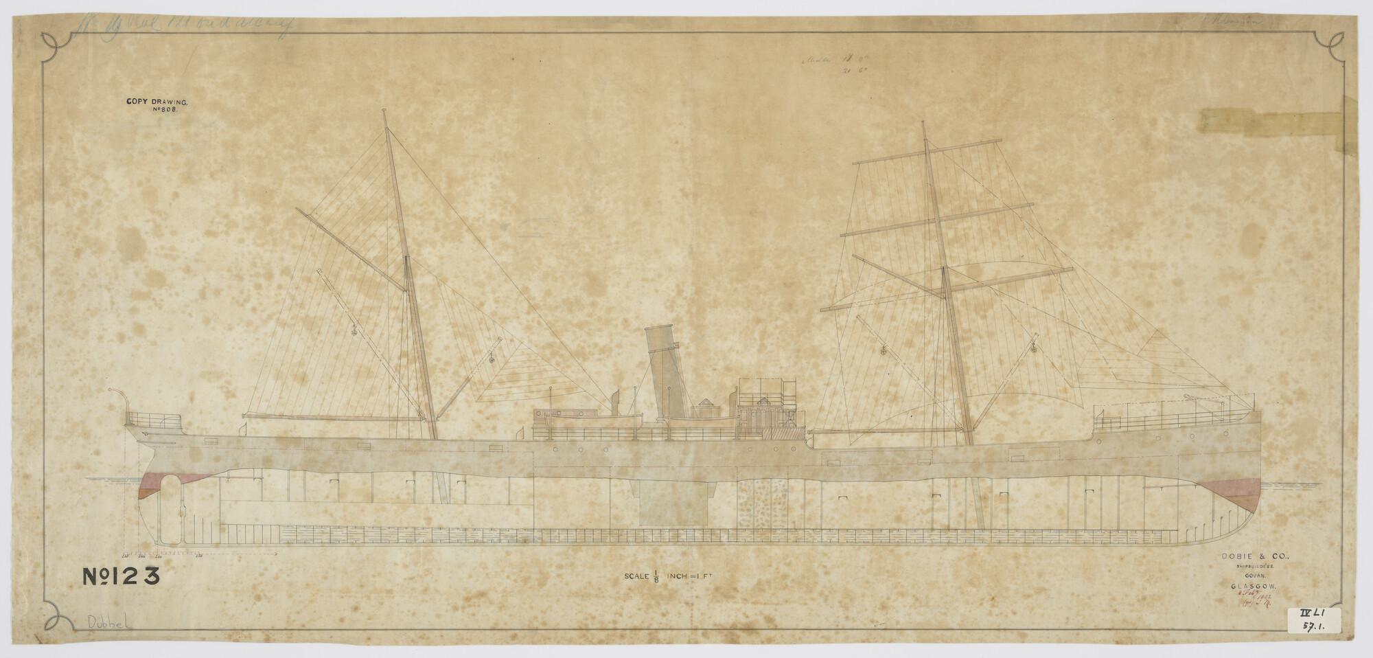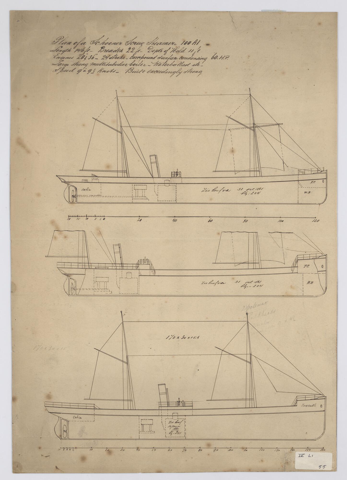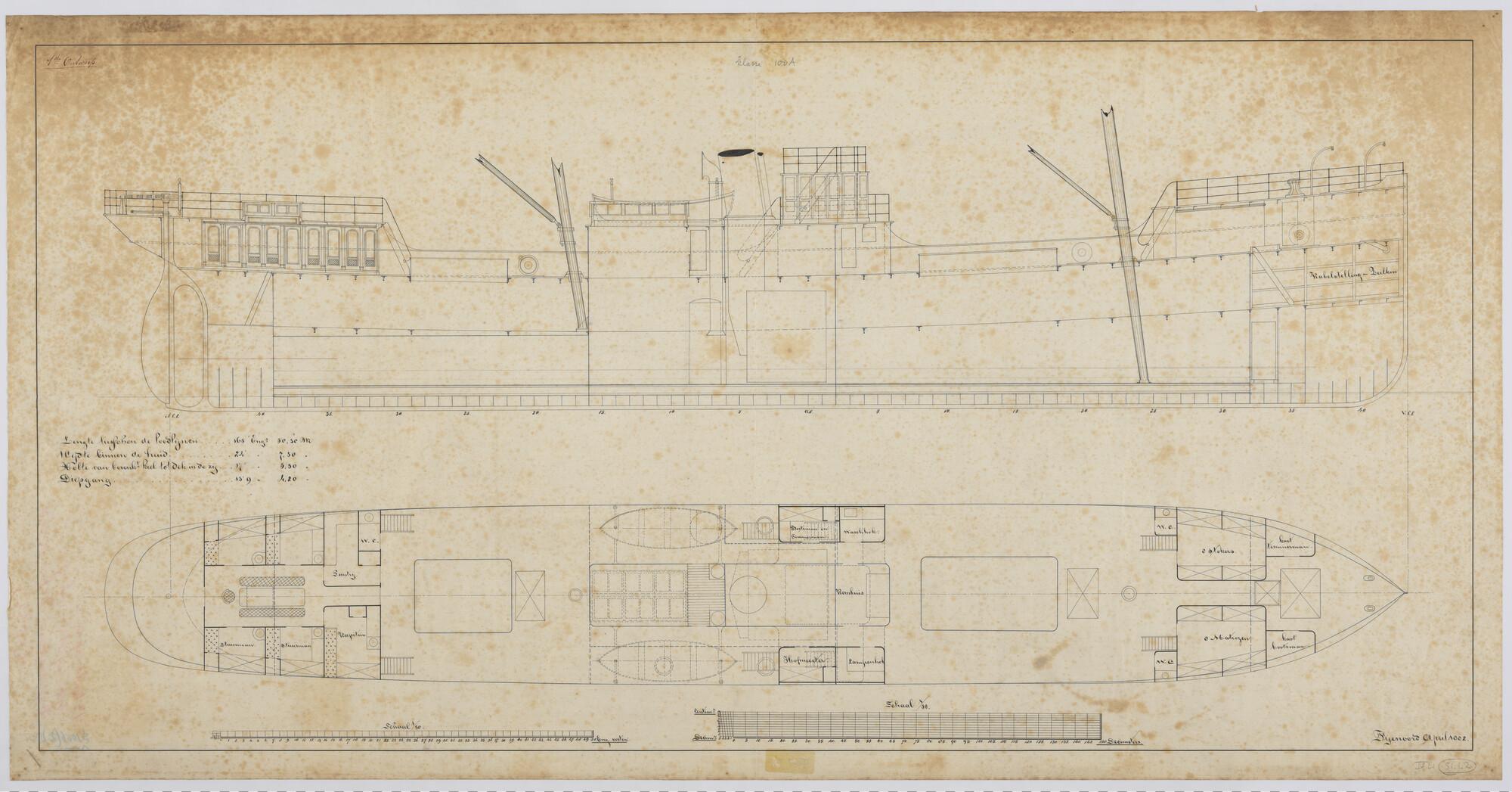Schroefstoomschip, 1881: zijaanzicht, verticale lang...