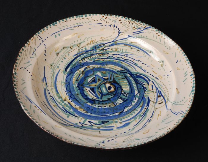 Crèmekleurige wandschotel met blauw-groene decoratie