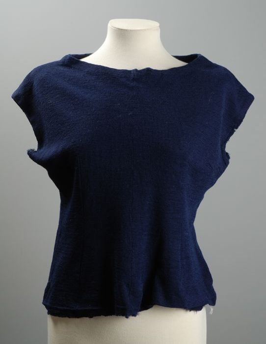 Blouse, donkerblauwe katoen, rode bies, rode knopen,...