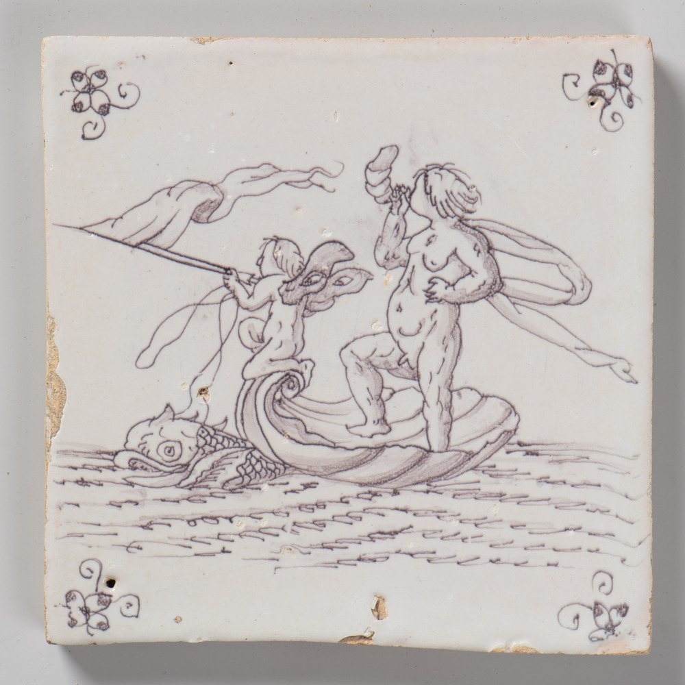 tegel van keramiek met tinglazuur, voorstellende: dr...