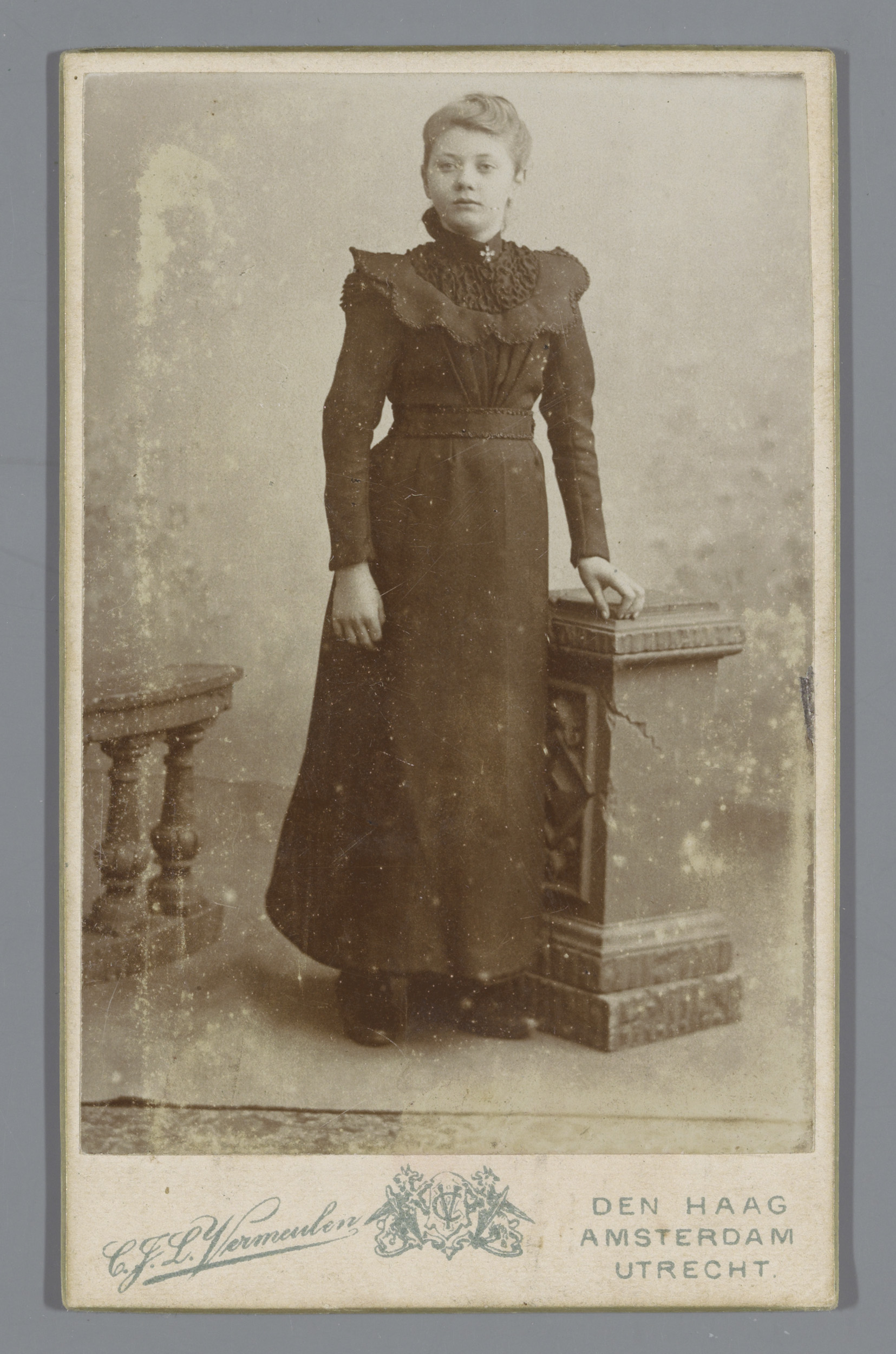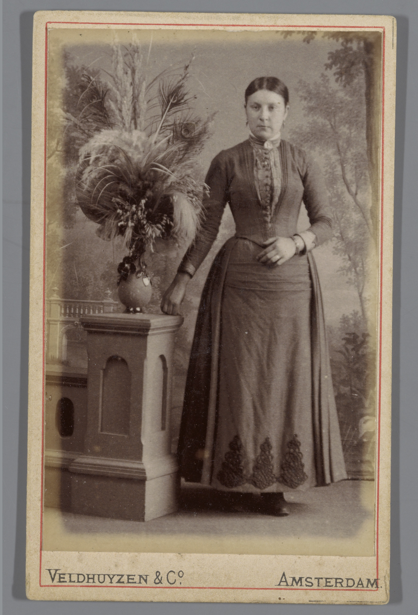Portret van een onbekende vrouw, staande naast een s...