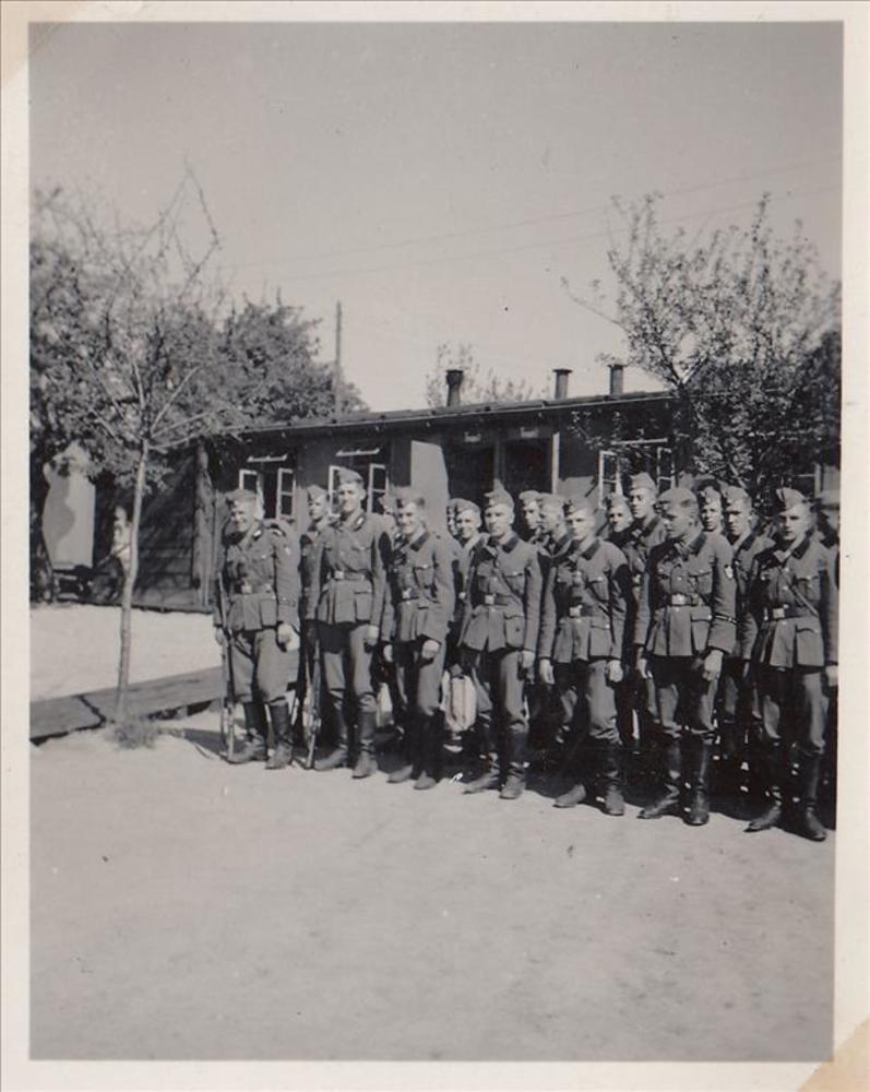 Foto van een groep mannen (18?) op een zanderig terr...