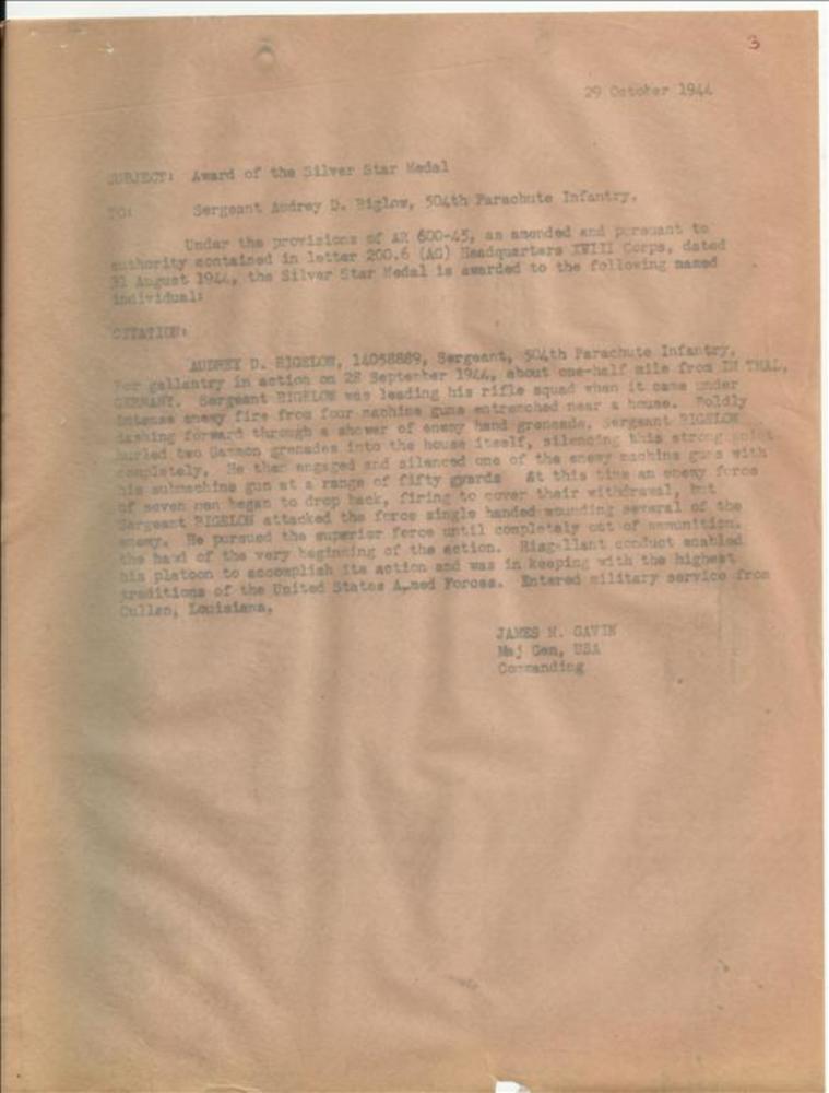 Brief van James Gavin, betreffende Silver Star Medal...