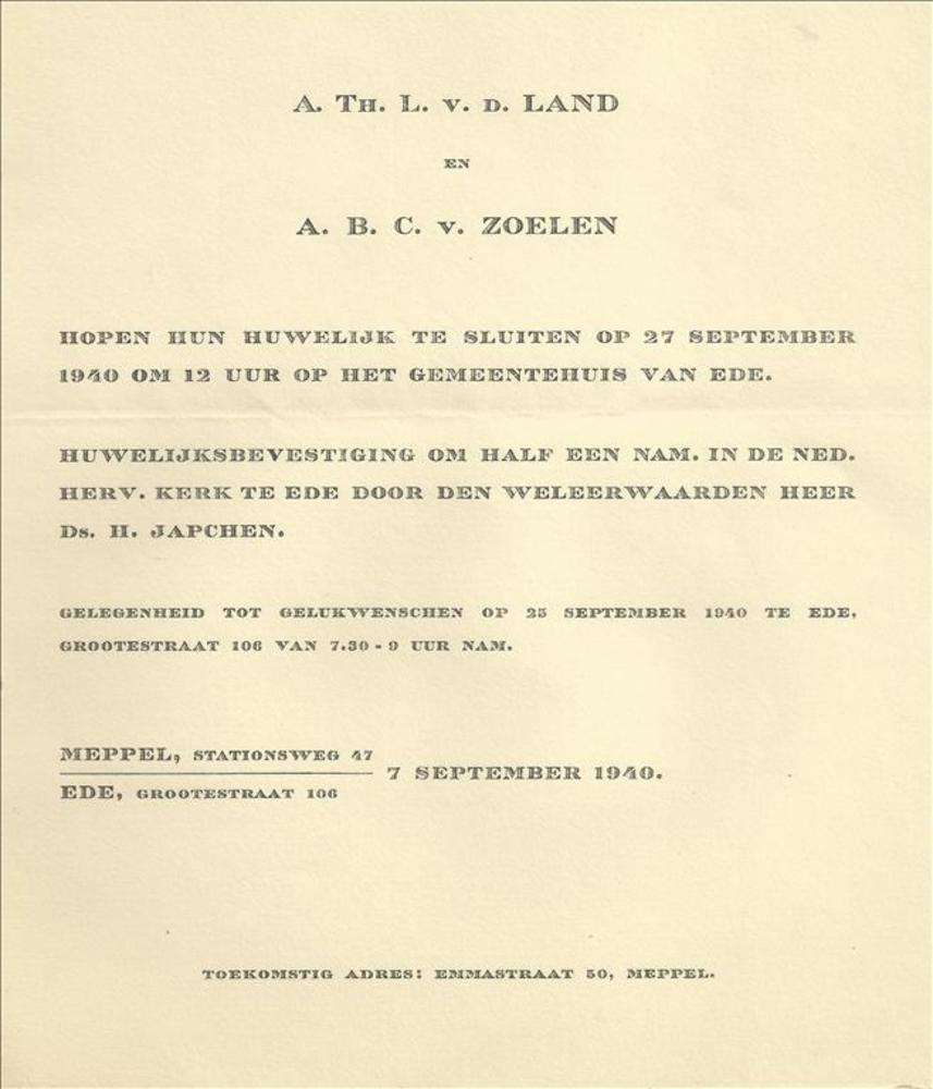 Huwelijksaankondiging van A. Th v.d Land en A.B.C. v...