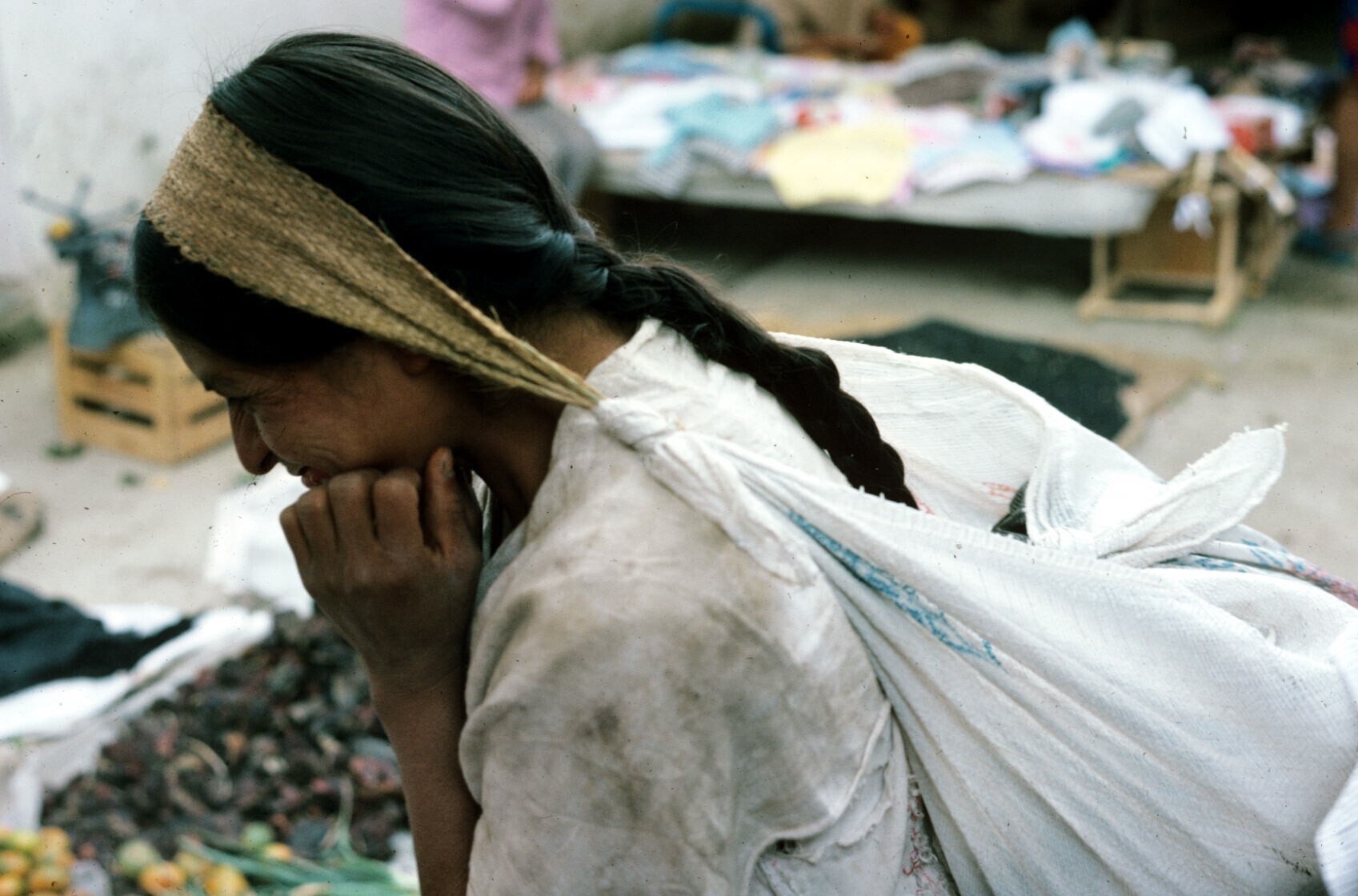 vrouw, last dragend met tumpline, bij milpa (akker)