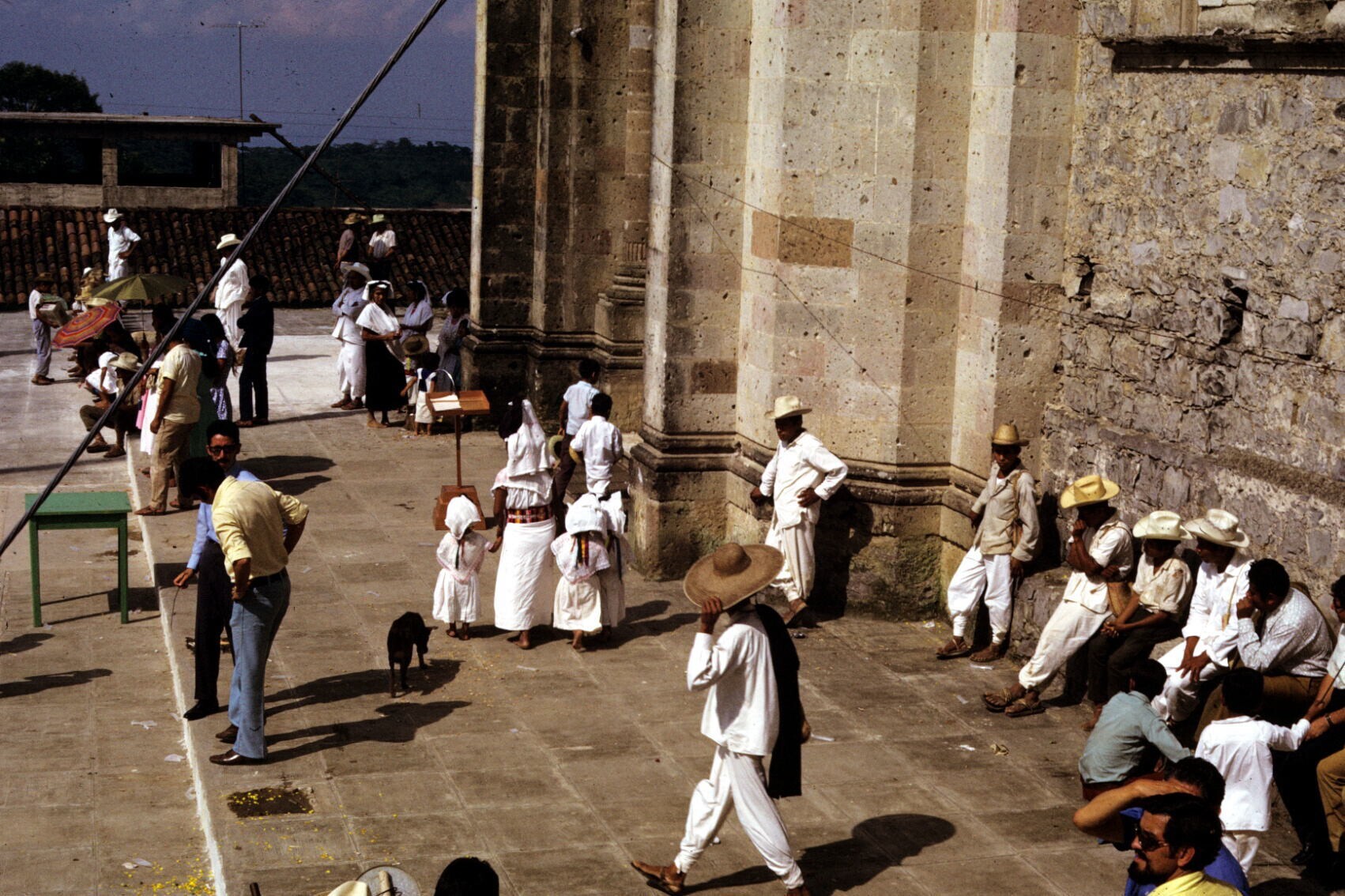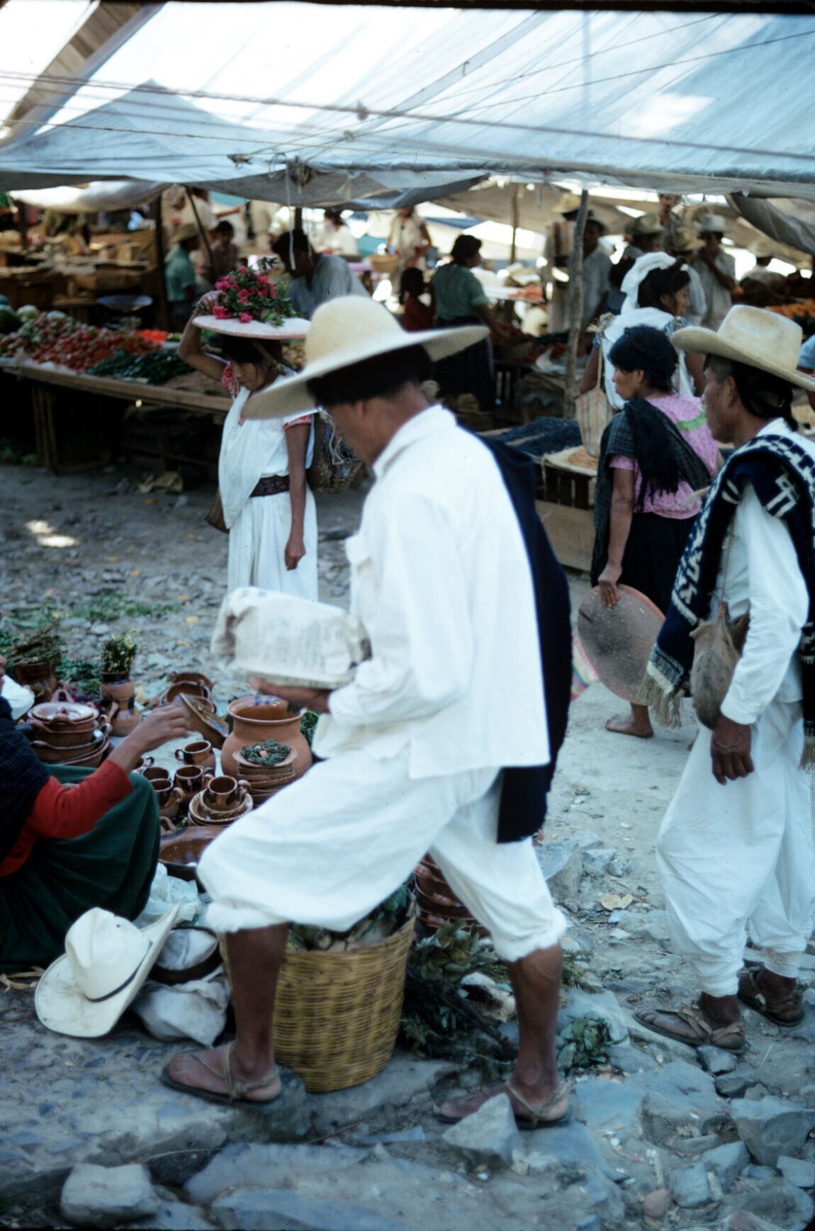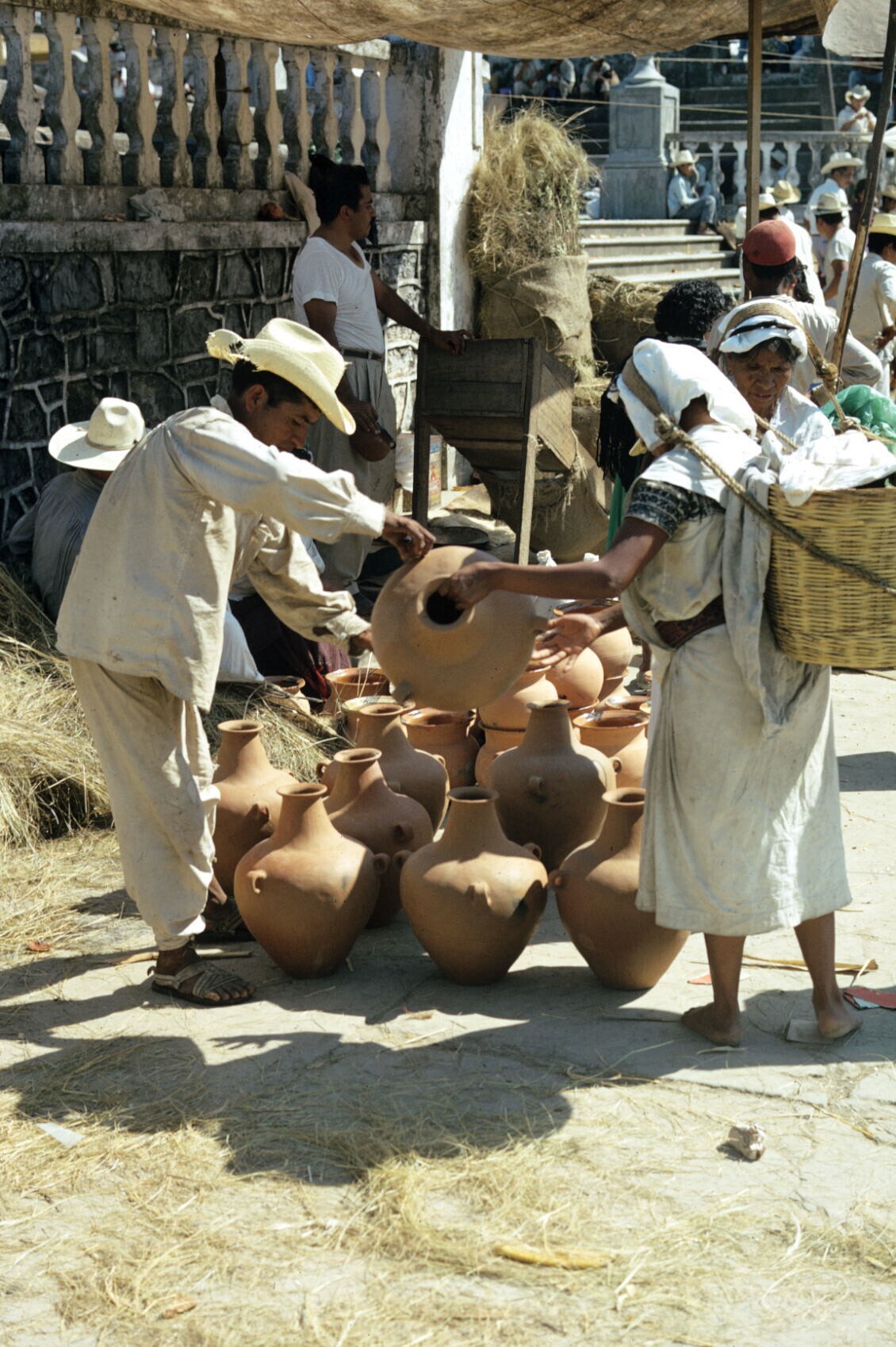 mannen in traje indio op markt; op voorgrond: aardewerk