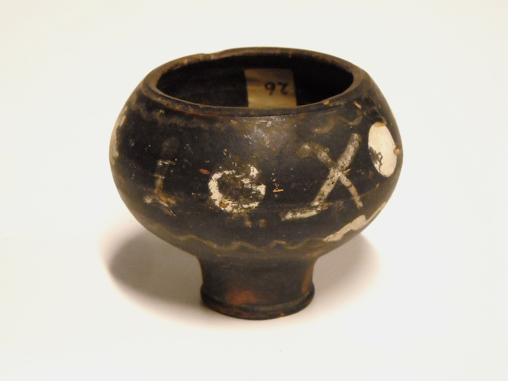 Bekertje van geverfd aardewerk beschilderd met de dr...