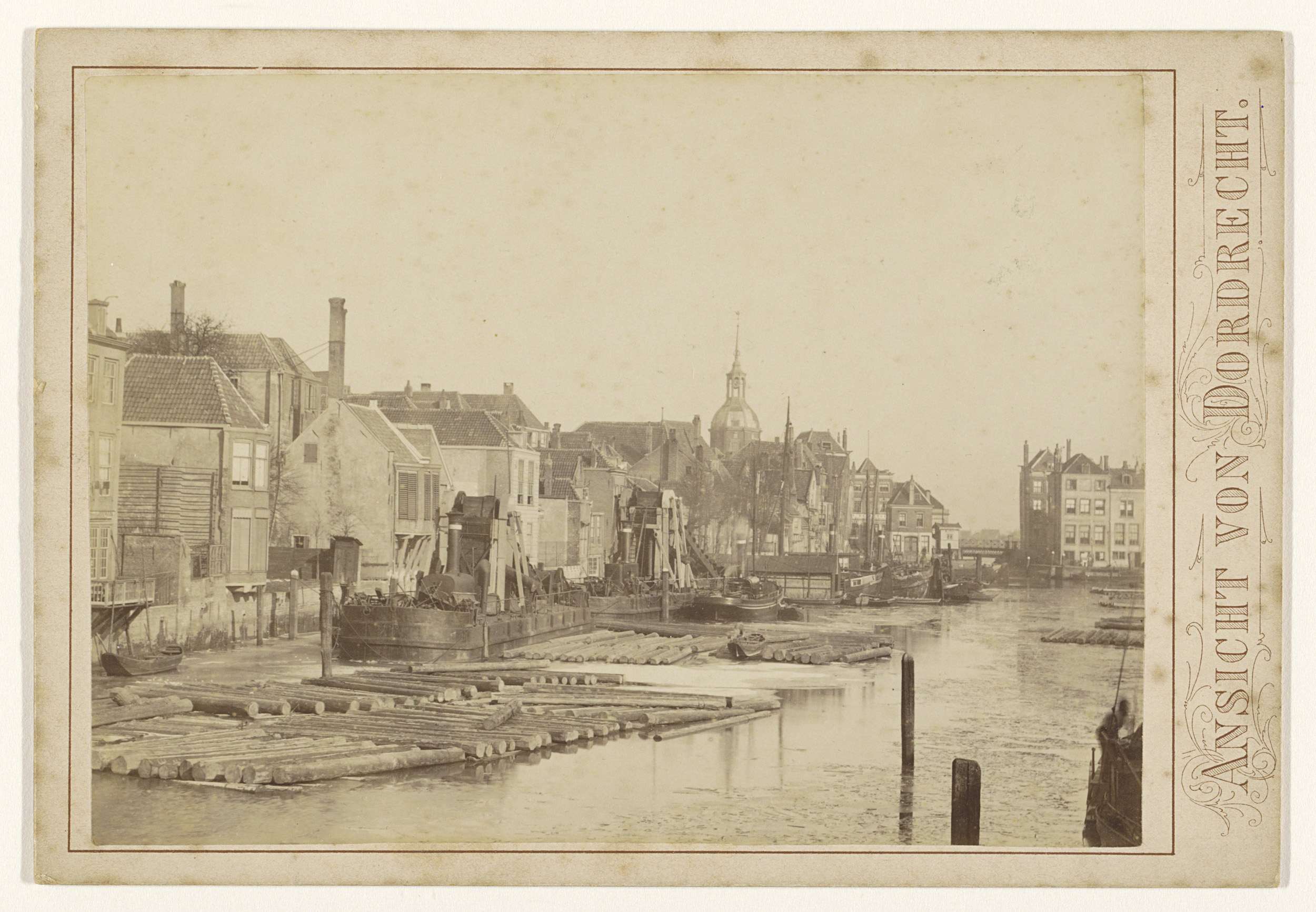 Gezicht op Dordrecht, met schepen aan de kade en de ...