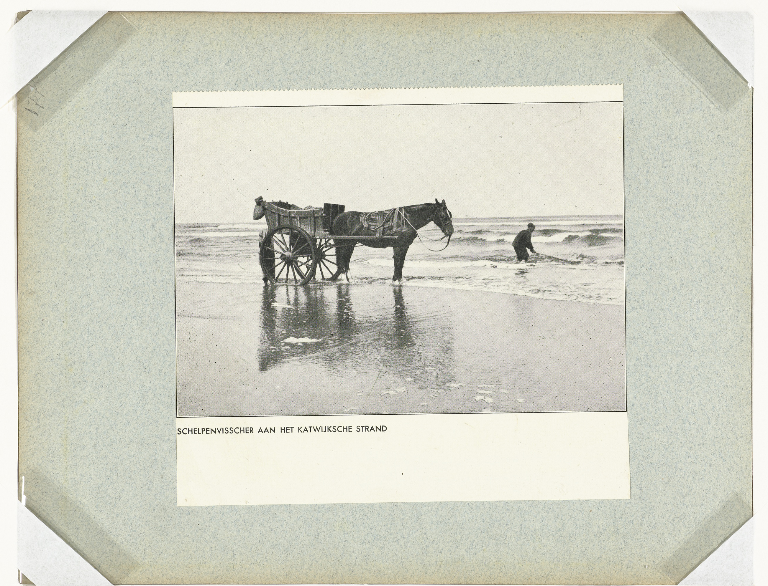 Schelpenvisser aan het strand met paard en wagen
