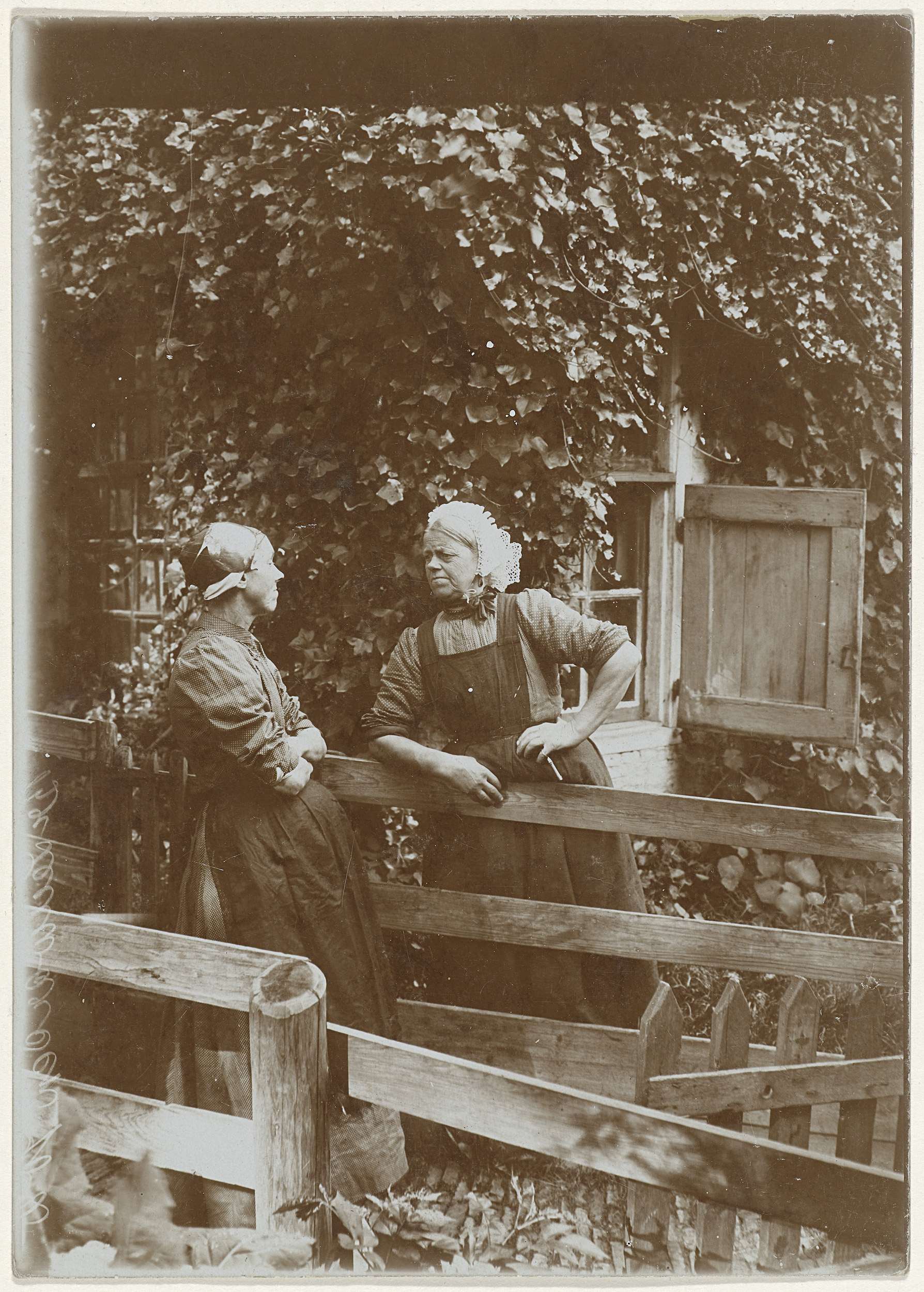 Twee buurvrouwen in gesprek bij een tuinhek, Leeuwarden