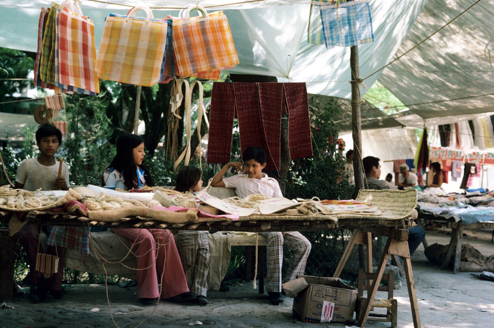 jonge verkopertjes in kraam met tassen op markt
