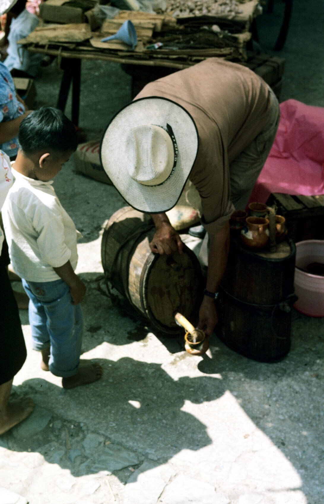 pulqueverkoper, pulque tappend uit vat