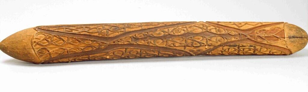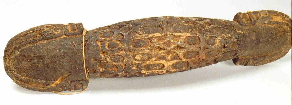 Ovalen, houten voedselbak met bewerkt uiteinde en ge...
