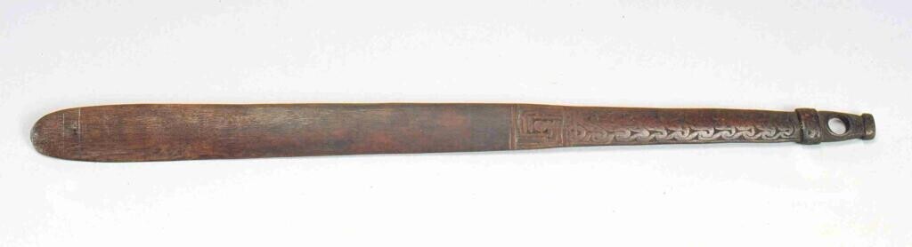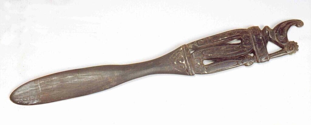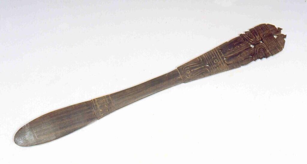 Ovalen, houten voedselbak met lange, bewerkte steel ...