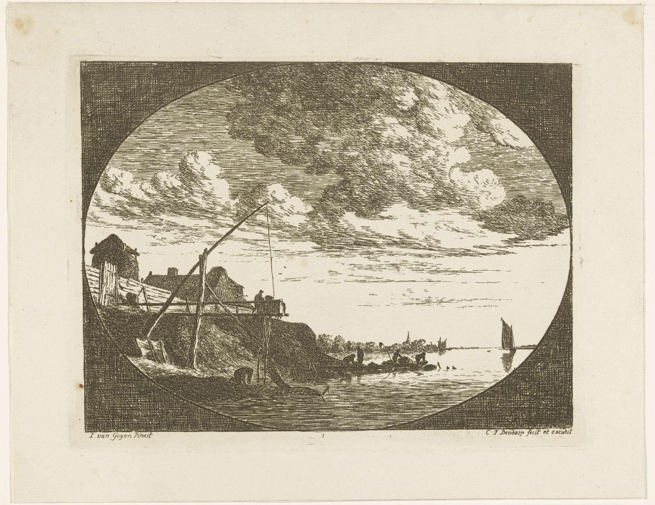Riviergezicht met vissers met fuiken en netten