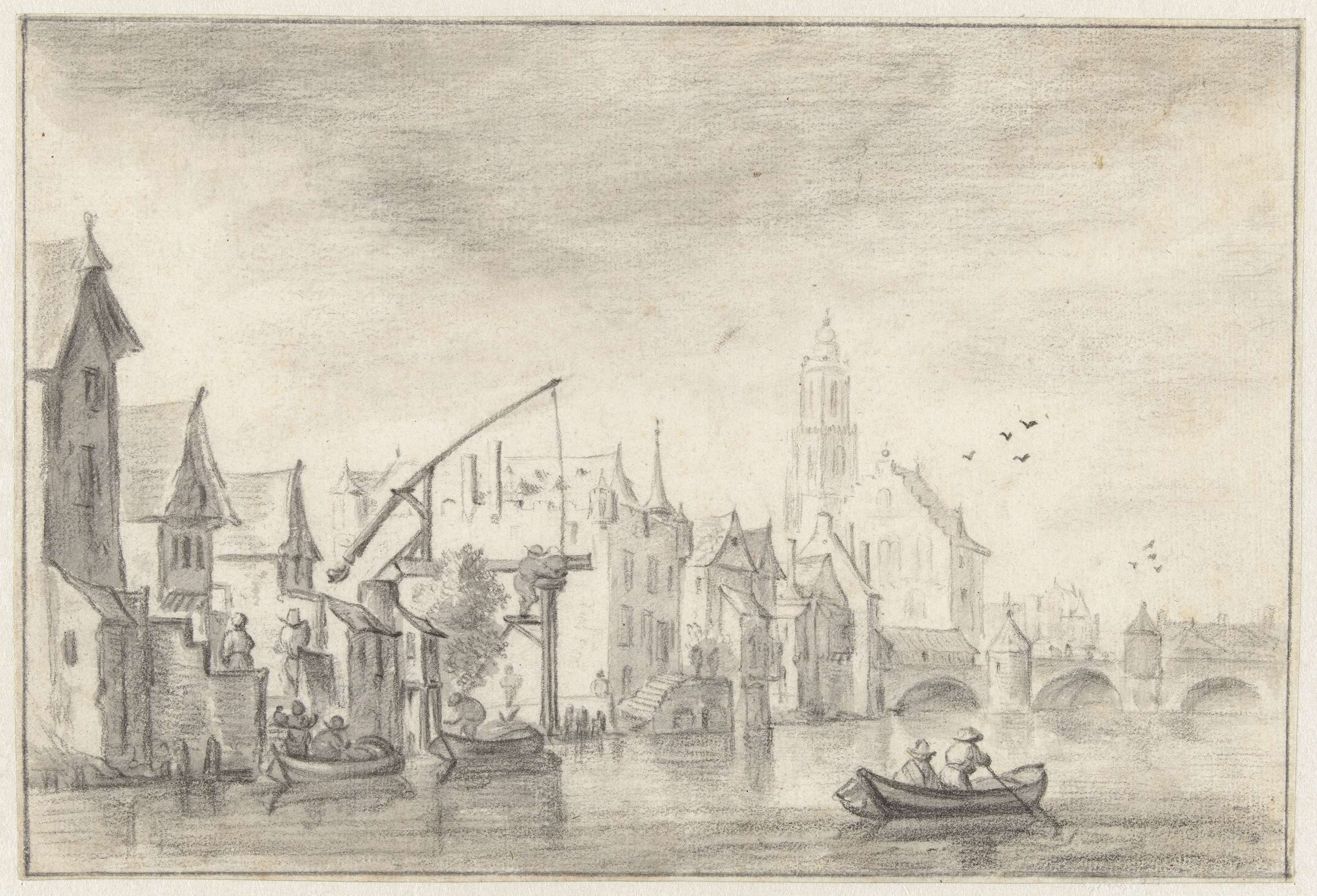 Riviergezicht met poortgebouw en kerk op oever