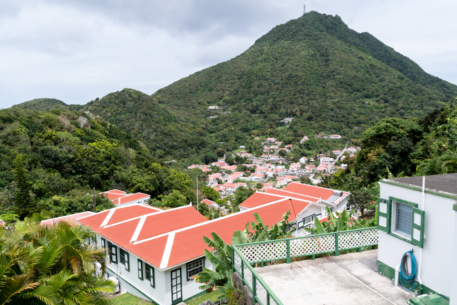 Zicht over Windwardside met Mount Scenery op de acht...