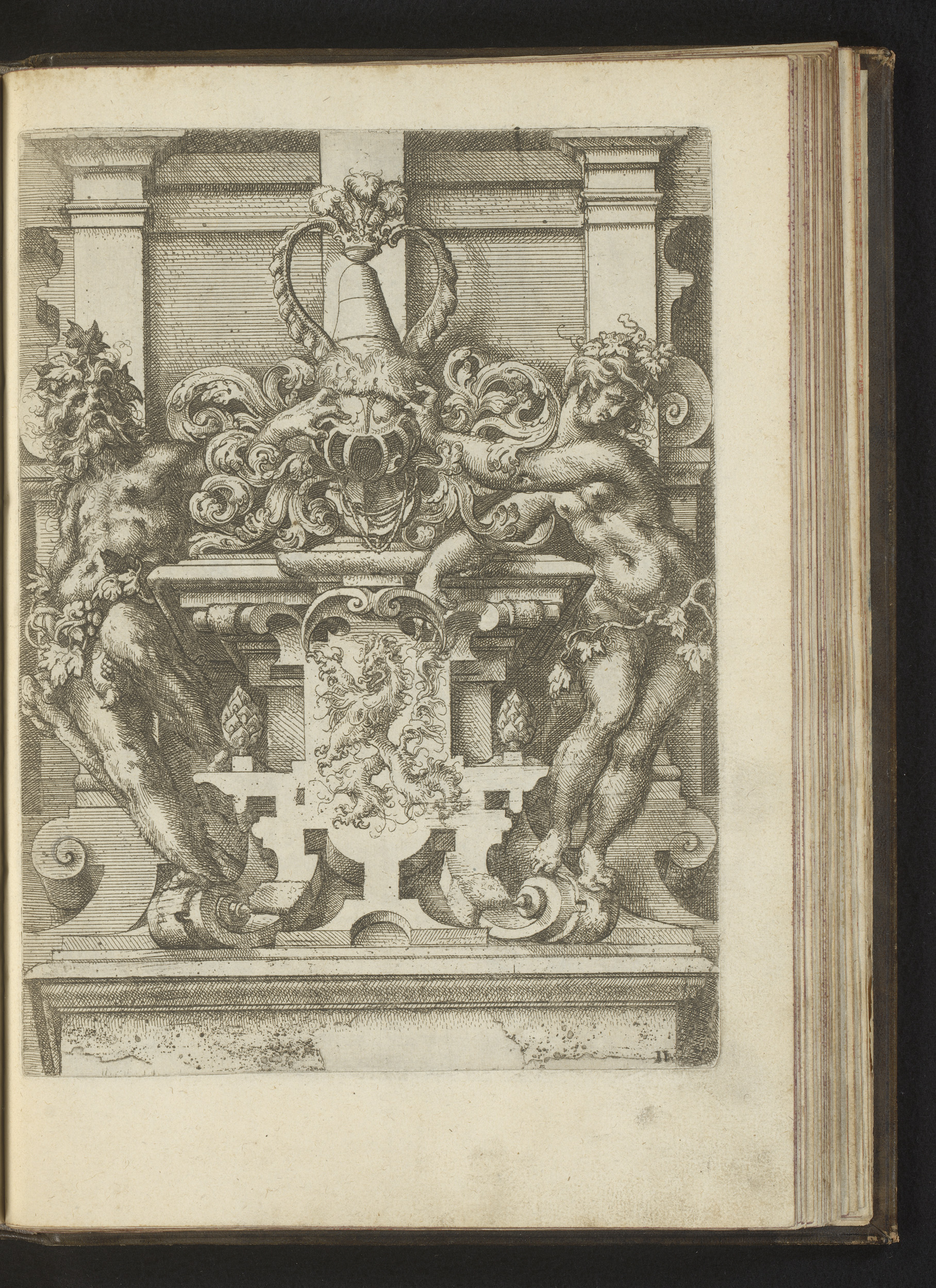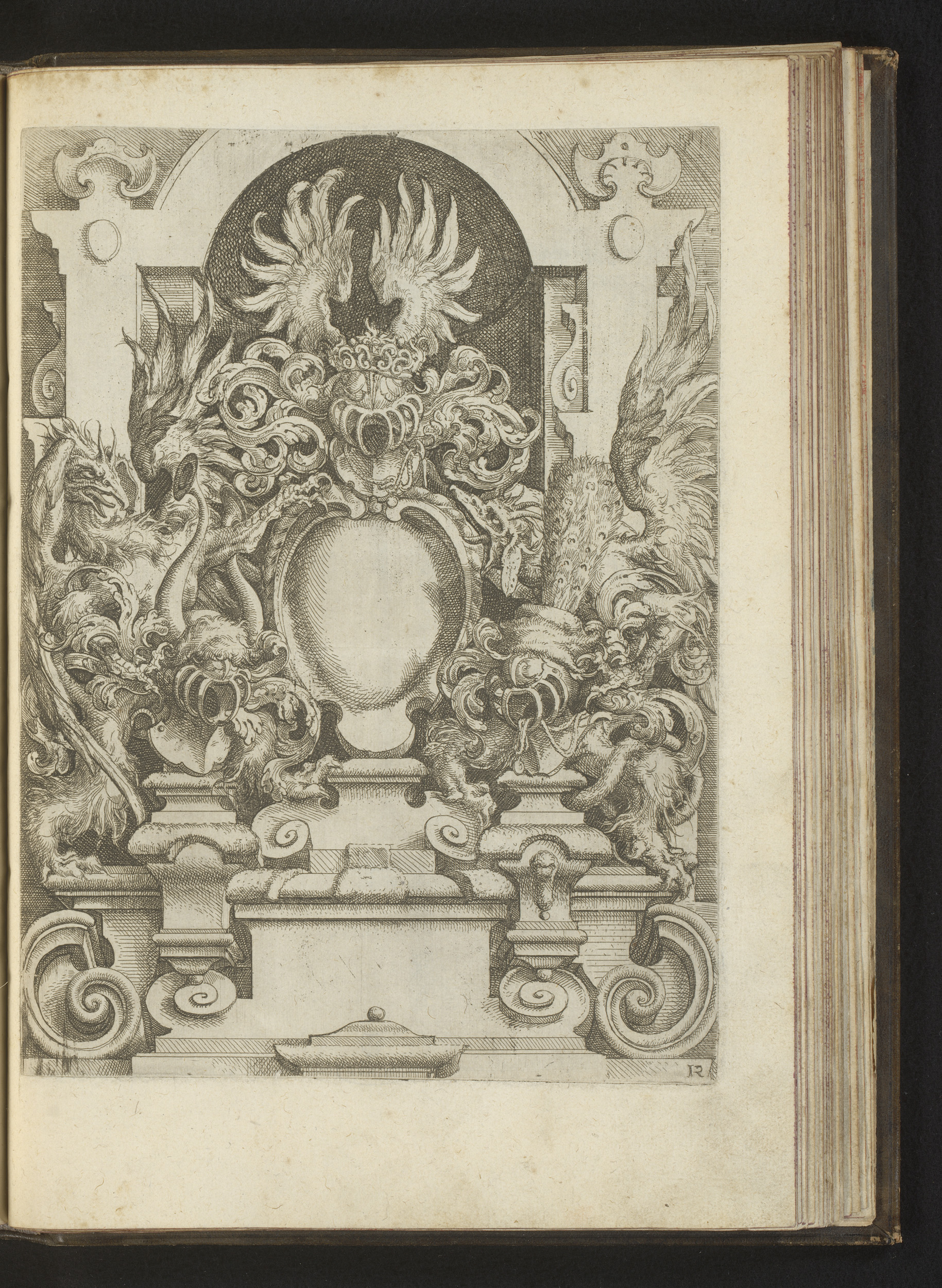 Cartouche op een sokkel geflankeerd door twee grote ...